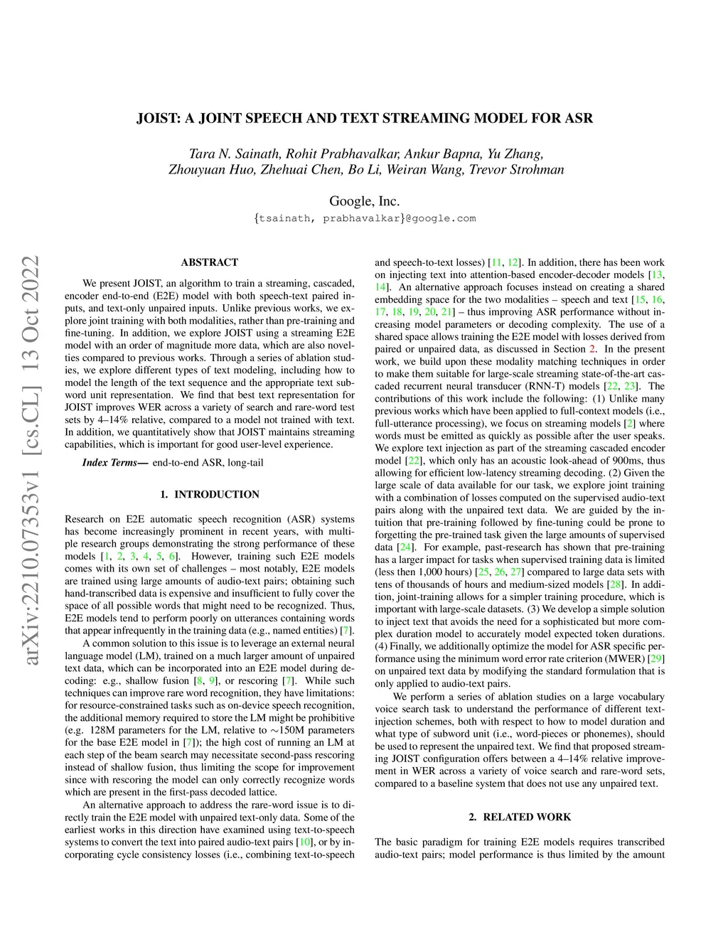 We present JOIST, an algorithm to train a streaming, cascaded, encoder end-to-end (E2E) model with both speech-text paired inputs, and text-only unpaired inputs. Unlike previous works, we explore joint training with both modalities, rather than pre-training and fine-tuning. In addition, we explore JOIST using a streaming E2E model with an order of magnitude more data, which are also novelties compared to previous works. Through a series of ablation studies, we explore different types of text modeling, including how to model the length of the text sequence and the appropriate text sub-word unit representation. We find that best text representation for JOIST improves WER across a variety of search and rare-word test sets by 4-14% relative, compared to a model not trained with text. In addition, we quantitatively show that JOIST maintains streaming capabilities, which is important for good user-level experience.