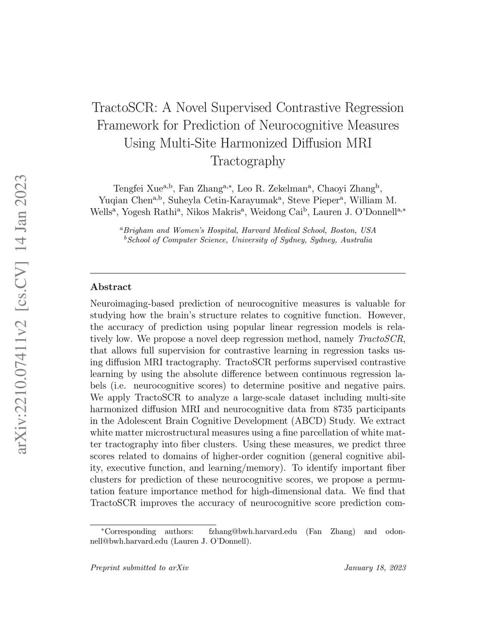 TractoSCR: A Novel Supervised Contrastive Regression Framework for