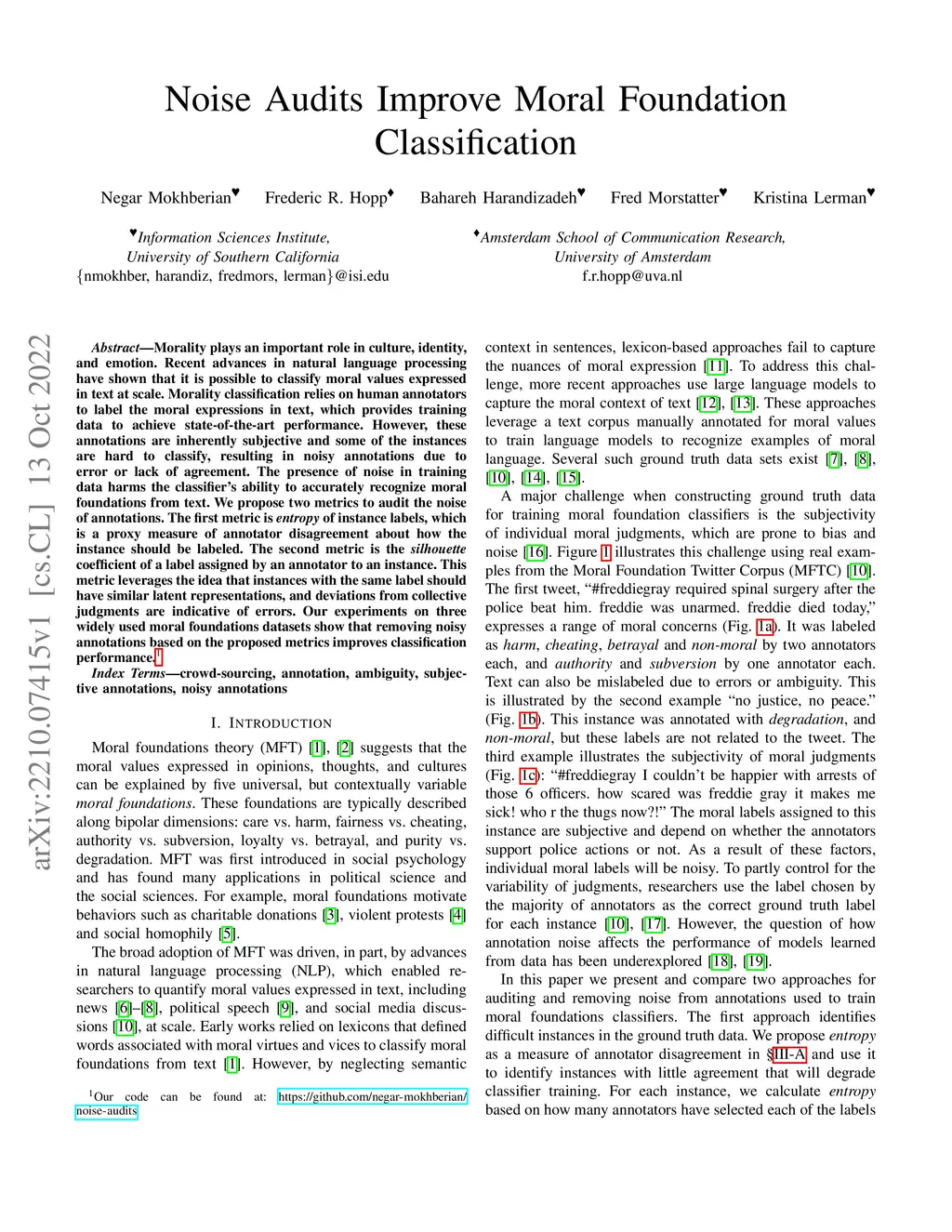 Morality plays an important role in culture, identity, and emotion. Recent advances in natural language processing have shown that it is possible to classify moral values expressed in text at scale. Morality classification relies on human annotators to label the moral expressions in text, which provides training data to achieve state-of-the-art performance. However, these annotations are inherently subjective and some of the instances are hard to classify, resulting in noisy annotations due to error or lack of agreement. The presence of noise in training data harms the classifier's ability to accurately recognize moral foundations from text. We propose two metrics to audit the noise of annotations. The first metric is entropy of instance labels, which is a proxy measure of annotator disagreement about how the instance should be labeled. The second metric is the silhouette coefficient of a label assigned by an annotator to an instance. This metric leverages the idea that instances with the same label should have similar latent representations, and deviations from collective judgments are indicative of errors. Our experiments on three widely used moral foundations datasets show that removing noisy annotations based on the proposed metrics improves classification performance.