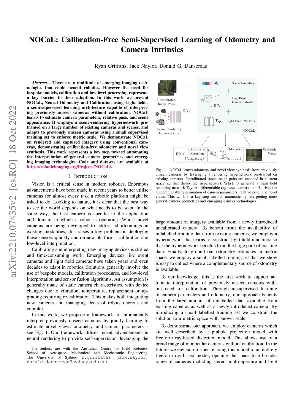 There are a multitude of emerging imaging technologies that could benefit robotics. However the need for bespoke models, calibration and low-level processing represents a key barrier to their adoption. In this work we present NOCaL, Neural odometry and Calibration using Light fields, a semi-supervised learning architecture capable of interpreting previously unseen cameras without calibration. NOCaL learns to estimate camera parameters, relative pose, and scene appearance. It employs a scene-rendering hypernetwork pretrained on a large number of existing cameras and scenes, and adapts to previously unseen cameras using a small supervised training set to enforce metric scale. We demonstrate NOCaL on rendered and captured imagery using conventional cameras, demonstrating calibration-free odometry and novel view synthesis. This work represents a key step toward automating the interpretation of general camera geometries and emerging imaging technologies.