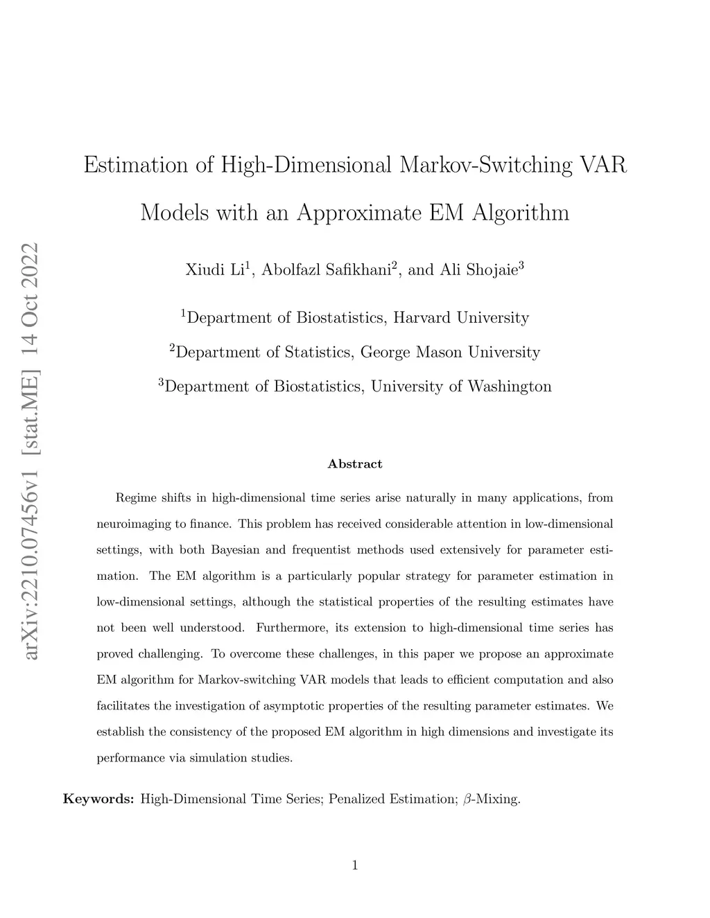 Regime shifts in high-dimensional time series arise naturally in many applications, from neuroimaging to finance. This problem has received considerable attention in low-dimensional settings, with both Bayesian and frequentist methods used extensively for parameter estimation. The EM algorithm is a particularly popular strategy for parameter estimation in low-dimensional settings, although the statistical properties of the resulting estimates have not been well understood. Furthermore, its extension to high-dimensional time series has proved challenging. To overcome these challenges, in this paper we propose an approximate EM algorithm for Markov-switching VAR models that leads to efficient computation and also facilitates the investigation of asymptotic properties of the resulting parameter estimates. We establish the consistency of the proposed EM algorithm in high dimensions and investigate its performance via simulation studies. We also demonstrate the algorithm by analyzing a brain electroencephalography (EEG) dataset recorded on a patient experiencing epileptic seizure.