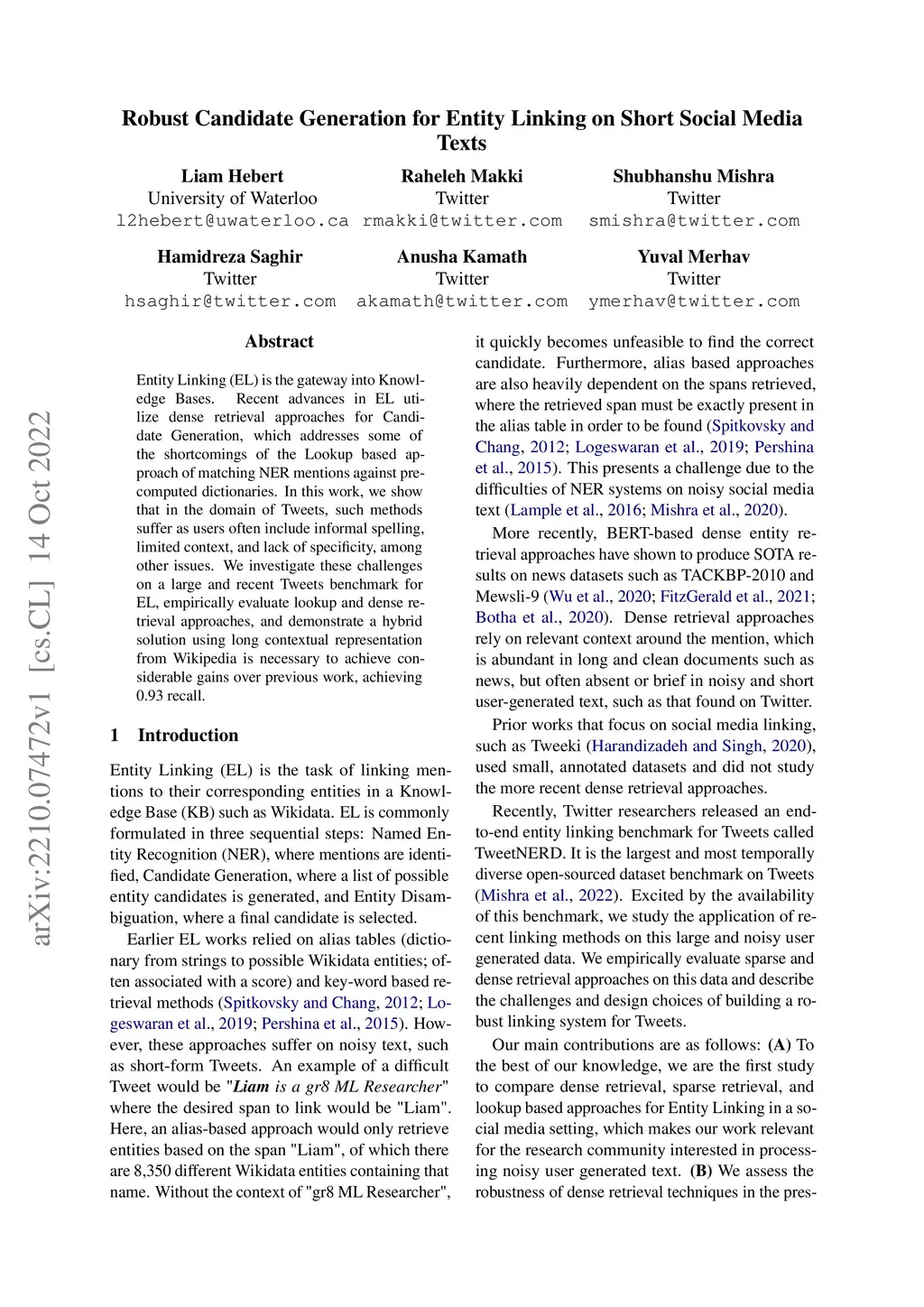 Entity Linking (EL) is the gateway into Knowledge Bases. Recent advances in EL utilize dense retrieval approaches for Candidate Generation, which addresses some of the shortcomings of the Lookup based approach of matching NER mentions against pre-computed dictionaries. In this work, we show that in the domain of Tweets, such methods suffer as users often include informal spelling, limited context, and lack of specificity, among other issues. We investigate these challenges on a large and recent Tweets benchmark for EL, empirically evaluate lookup and dense retrieval approaches, and demonstrate a hybrid solution using long contextual representation from Wikipedia is necessary to achieve considerable gains over previous work, achieving 0.93 recall.