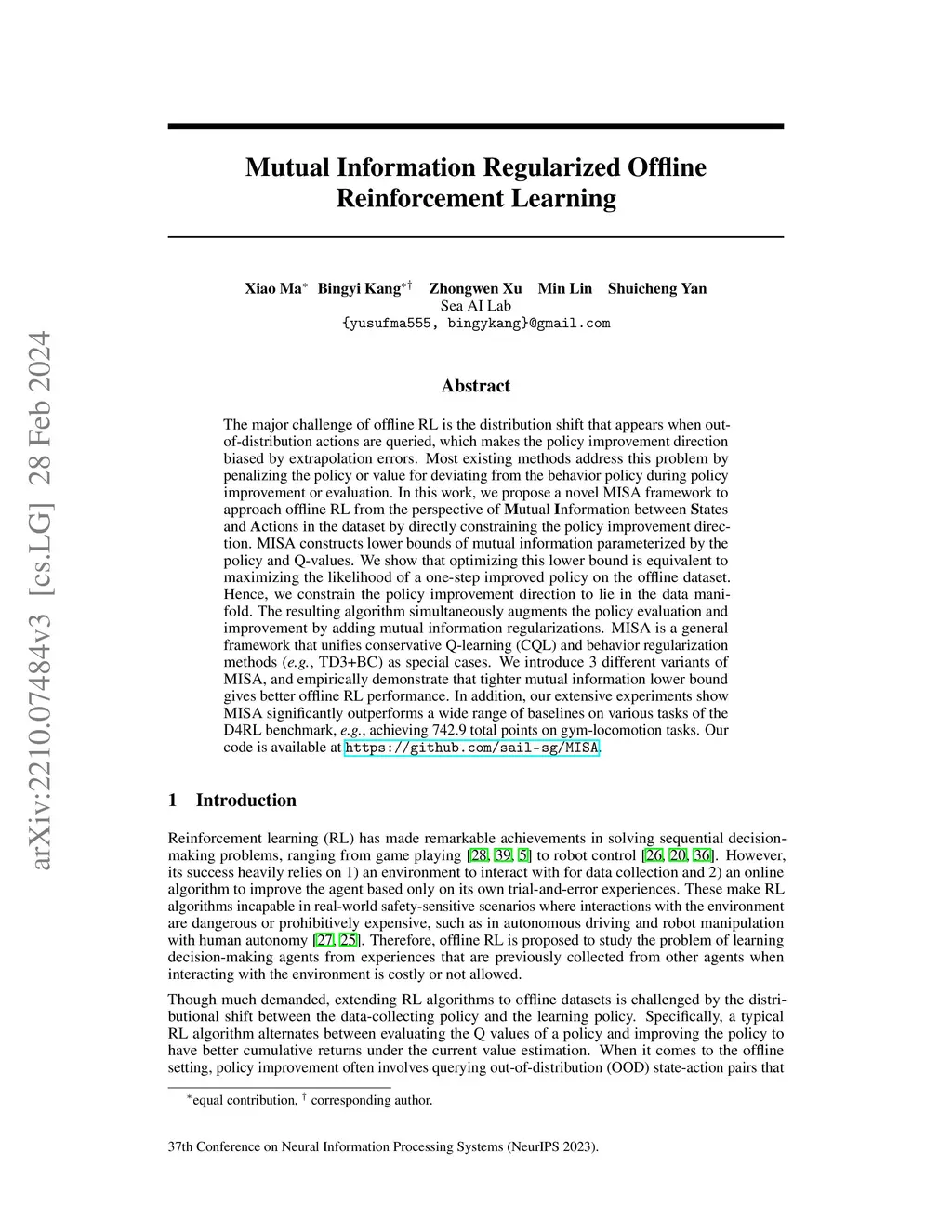Offline reinforcement learning (RL) aims at learning an effective policy from offline datasets without active interactions with the environment. The major challenge of offline RL is the distribution shift that appears when out-of-distribution actions are queried, which makes the policy improvement direction biased by extrapolation errors. Most existing methods address this problem by penalizing the policy for deviating from the behavior policy during policy improvement or making conservative updates for value functions during policy evaluation. In this work, we propose a novel MISA framework to approach offline RL from the perspective of Mutual Information between States and Actions in the dataset by directly constraining the policy improvement direction. Intuitively, mutual information measures the mutual dependence of actions and states, which reflects how a behavior agent reacts to certain environment states during data collection. To effectively utilize this information to facilitate policy learning, MISA constructs lower bounds of mutual information parameterized by the policy and Q-values. We show that optimizing this lower bound is equivalent to maximizing the likelihood of a one-step improved policy on the offline dataset. In this way, we constrain the policy improvement direction to lie in the data manifold. The resulting algorithm simultaneously augments the policy evaluation and improvement by adding a mutual information regularization. MISA is a general offline RL framework that unifies conservative Q-learning (CQL) and behavior regularization methods (e.g., TD3+BC) as special cases. Our experiments show that MISA performs significantly better than existing methods and achieves new state-of-the-art on various tasks of the D4RL benchmark.