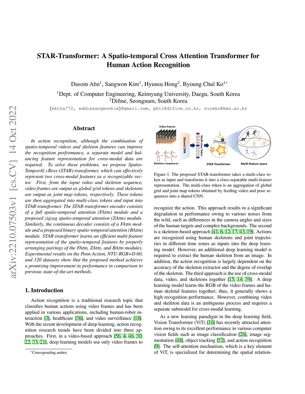 In action recognition, although the combination of spatio-temporal videos and skeleton features can improve the recognition performance, a separate model and balancing feature representation for cross-modal data are required. To solve these problems, we propose Spatio-TemporAl cRoss (STAR)-transformer, which can effectively represent two cross-modal features as a recognizable vector. First, from the input video and skeleton sequence, video frames are output as global grid tokens and skeletons are output as joint map tokens, respectively. These tokens are then aggregated into multi-class tokens and input into STAR-transformer. The STAR-transformer encoder layer consists of a full self-attention (FAttn) module and a proposed zigzag spatio-temporal attention (ZAttn) module. Similarly, the continuous decoder consists of a FAttn module and a proposed binary spatio-temporal attention (BAttn) module. STAR-transformer learns an efficient multi-feature representation of the spatio-temporal features by properly arranging pairings of the FAttn, ZAttn, and BAttn modules. Experimental results on the Penn-Action, NTU RGB+D 60, and 120 datasets show that the proposed method achieves a promising improvement in performance in comparison to previous state-of-the-art methods.