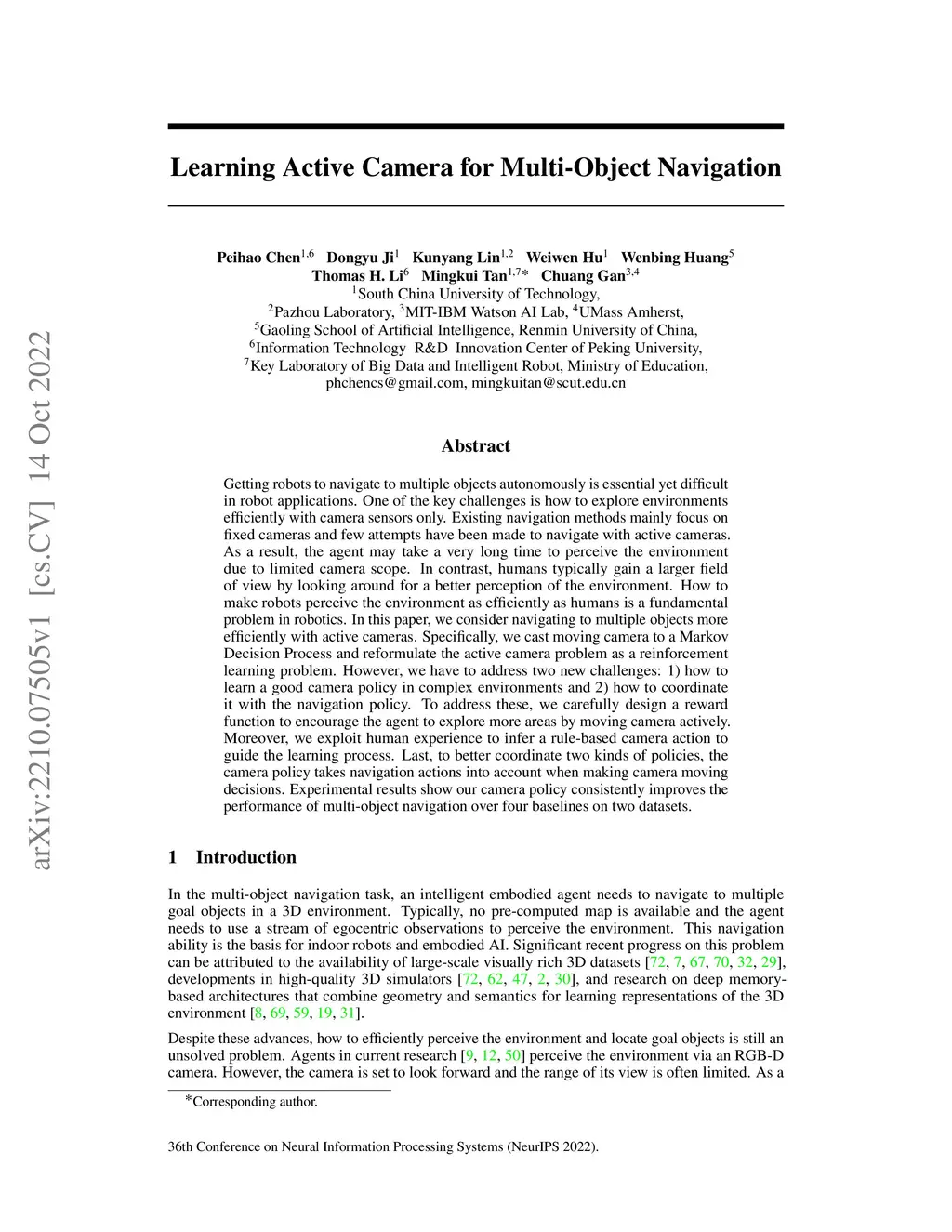 Learning Active Camera for Multi-Object Navigation
