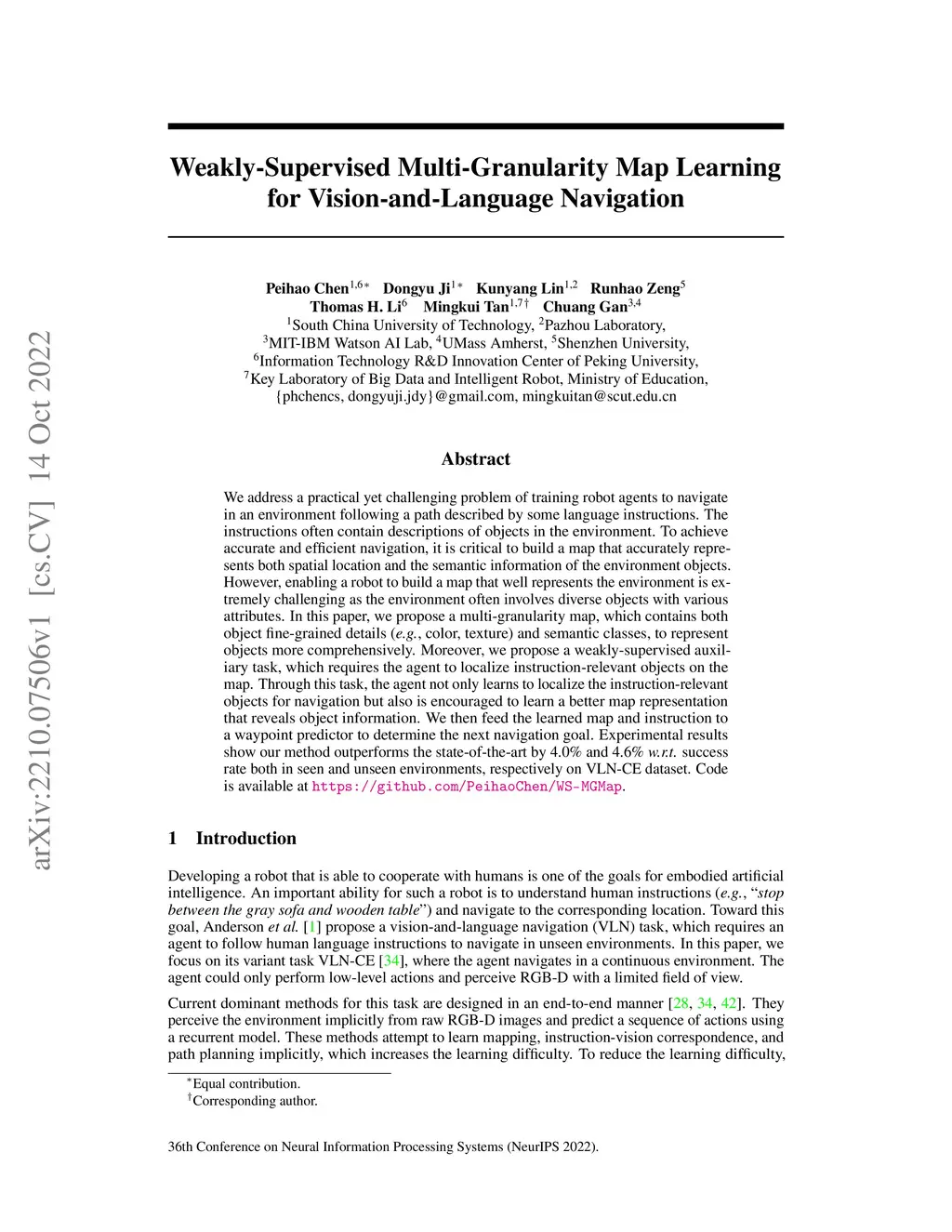 We address a practical yet challenging problem of training robot agents to navigate in an environment following a path described by some language instructions. The instructions often contain descriptions of objects in the environment. To achieve accurate and efficient navigation, it is critical to build a map that accurately represents both spatial location and the semantic information of the environment objects. However, enabling a robot to build a map that well represents the environment is extremely challenging as the environment often involves diverse objects with various attributes. In this paper, we propose a multi-granularity map, which contains both object fine-grained details (e.g., color, texture) and semantic classes, to represent objects more comprehensively. Moreover, we propose a weakly-supervised auxiliary task, which requires the agent to localize instruction-relevant objects on the map. Through this task, the agent not only learns to localize the instruction-relevant objects for navigation but also is encouraged to learn a better map representation that reveals object information. We then feed the learned map and instruction to a waypoint predictor to determine the next navigation goal. Experimental results show our method outperforms the state-of-the-art by 4.0% and 4.6% w.r.t. success rate both in seen and unseen environments, respectively on VLN-CE dataset. Code is available at https://github.com/PeihaoChen/WS-MGMap.