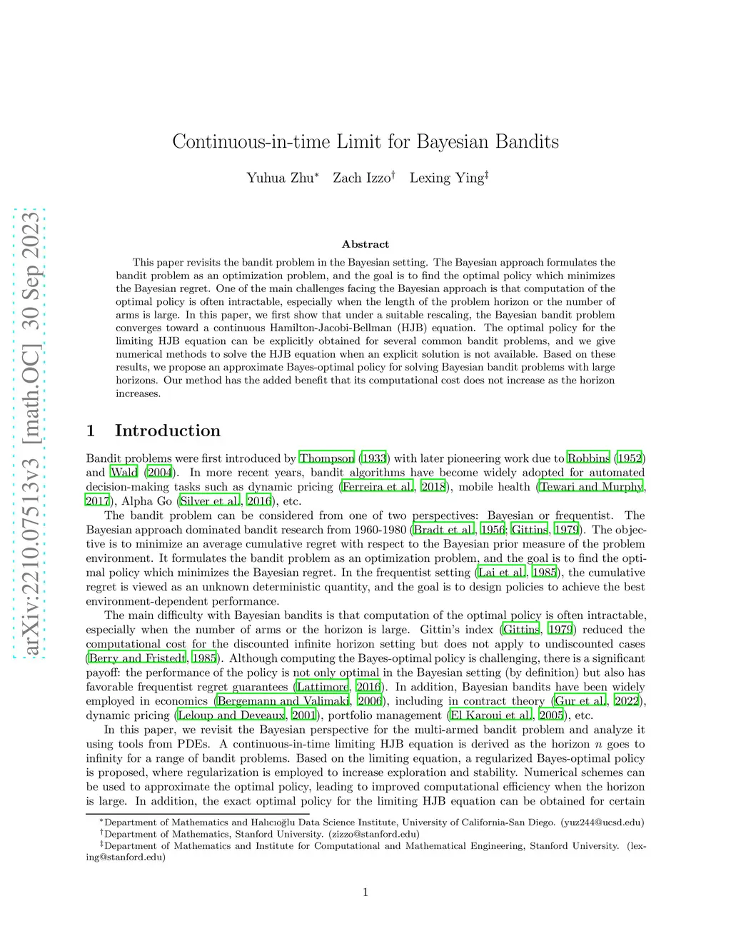 This paper revisits the bandit problem in the Bayesian setting. The Bayesian approach formulates the bandit problem as an optimization problem, and the goal is to find the optimal policy which minimizes the Bayesian regret. One of the main challenges facing the Bayesian approach is that computation of the optimal policy is often intractable, especially when the length of the problem horizon or the number of arms is large. In this paper, we first show that under a suitable rescaling, the Bayesian bandit problem converges toward a continuous Hamilton-Jacobi-Bellman (HJB) equation. The optimal policy for the limiting HJB equation can be explicitly obtained for several common bandit problems, and we give numerical methods to solve the HJB equation when an explicit solution is not available. Based on these results, we propose an approximate Bayes-optimal policy for solving Bayesian bandit problems with large horizons. Our method has the added benefit that its computational cost does not increase as the horizon increases.