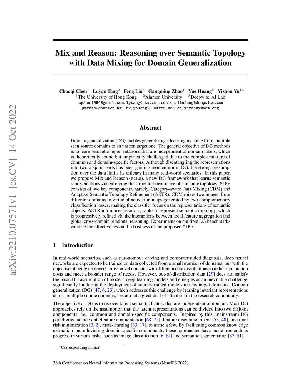 Domain generalization (DG) enables generalizing a learning machine from multiple seen source domains to an unseen target one. The general objective of DG methods is to learn semantic representations that are independent of domain labels, which is theoretically sound but empirically challenged due to the complex mixture of common and domain-specific factors. Although disentangling the representations into two disjoint parts has been gaining momentum in DG, the strong presumption over the data limits its efficacy in many real-world scenarios. In this paper, we propose Mix and Reason (\mire), a new DG framework that learns semantic representations via enforcing the structural invariance of semantic topology. \mire\ consists of two key components, namely, Category-aware Data Mixing (CDM) and Adaptive Semantic Topology Refinement (ASTR). CDM mixes two images from different domains in virtue of activation maps generated by two complementary classification losses, making the classifier focus on the representations of semantic objects. ASTR introduces relation graphs to represent semantic topology, which is progressively refined via the interactions between local feature aggregation and global cross-domain relational reasoning. Experiments on multiple DG benchmarks validate the effectiveness and robustness of the proposed \mire.