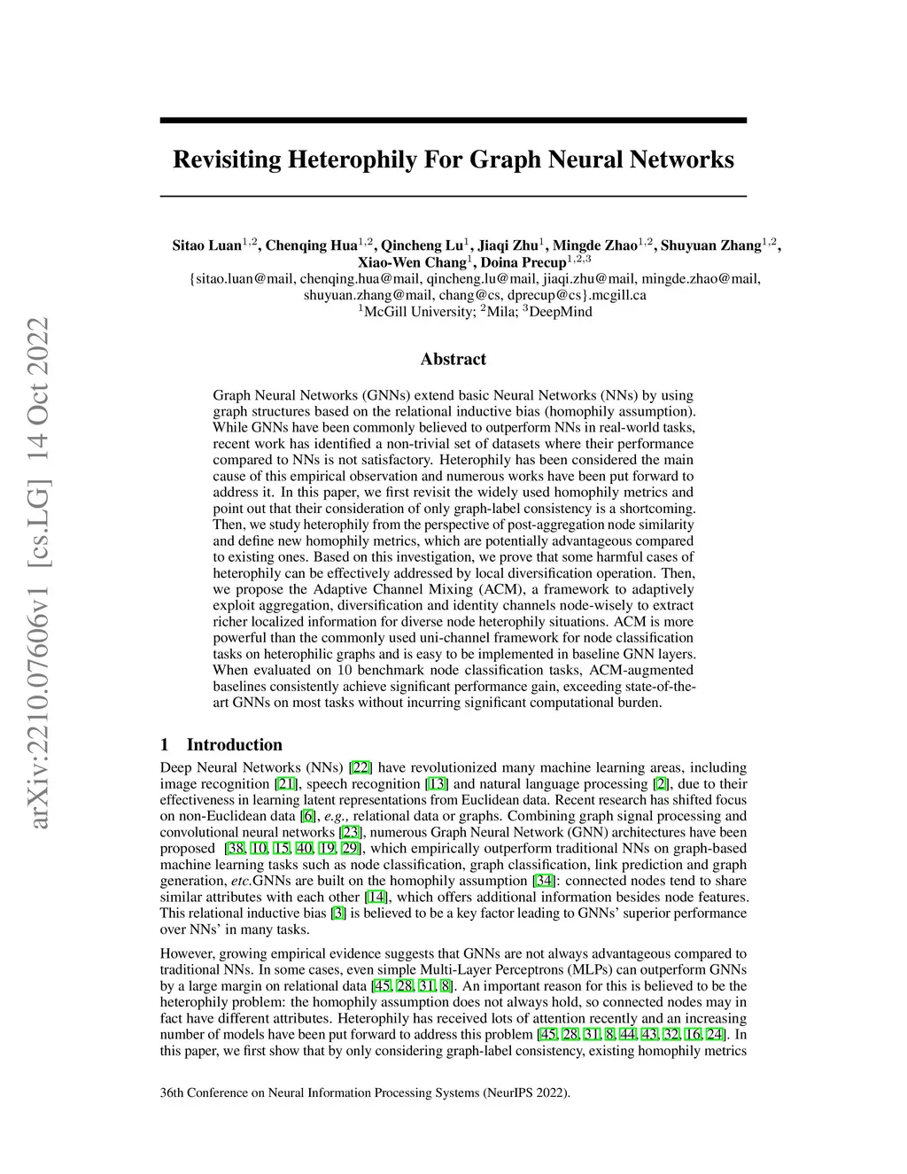 Graph Neural Networks (GNNs) extend basic Neural Networks (NNs) by using graph structures based on the relational inductive bias (homophily assumption). While GNNs have been commonly believed to outperform NNs in real-world tasks, recent work has identified a non-trivial set of datasets where their performance compared to NNs is not satisfactory. Heterophily has been considered the main cause of this empirical observation and numerous works have been put forward to address it. In this paper, we first revisit the widely used homophily metrics and point out that their consideration of only graph-label consistency is a shortcoming. Then, we study heterophily from the perspective of post-aggregation node similarity and define new homophily metrics, which are potentially advantageous compared to existing ones. Based on this investigation, we prove that some harmful cases of heterophily can be effectively addressed by local diversification operation. Then, we propose the Adaptive Channel Mixing (ACM), a framework to adaptively exploit aggregation, diversification and identity channels node-wisely to extract richer localized information for diverse node heterophily situations. ACM is more powerful than the commonly used uni-channel framework for node classification tasks on heterophilic graphs and is easy to be implemented in baseline GNN layers. When evaluated on 10 benchmark node classification tasks, ACM-augmented baselines consistently achieve significant performance gain, exceeding state-of-the-art GNNs on most tasks without incurring significant computational burden.