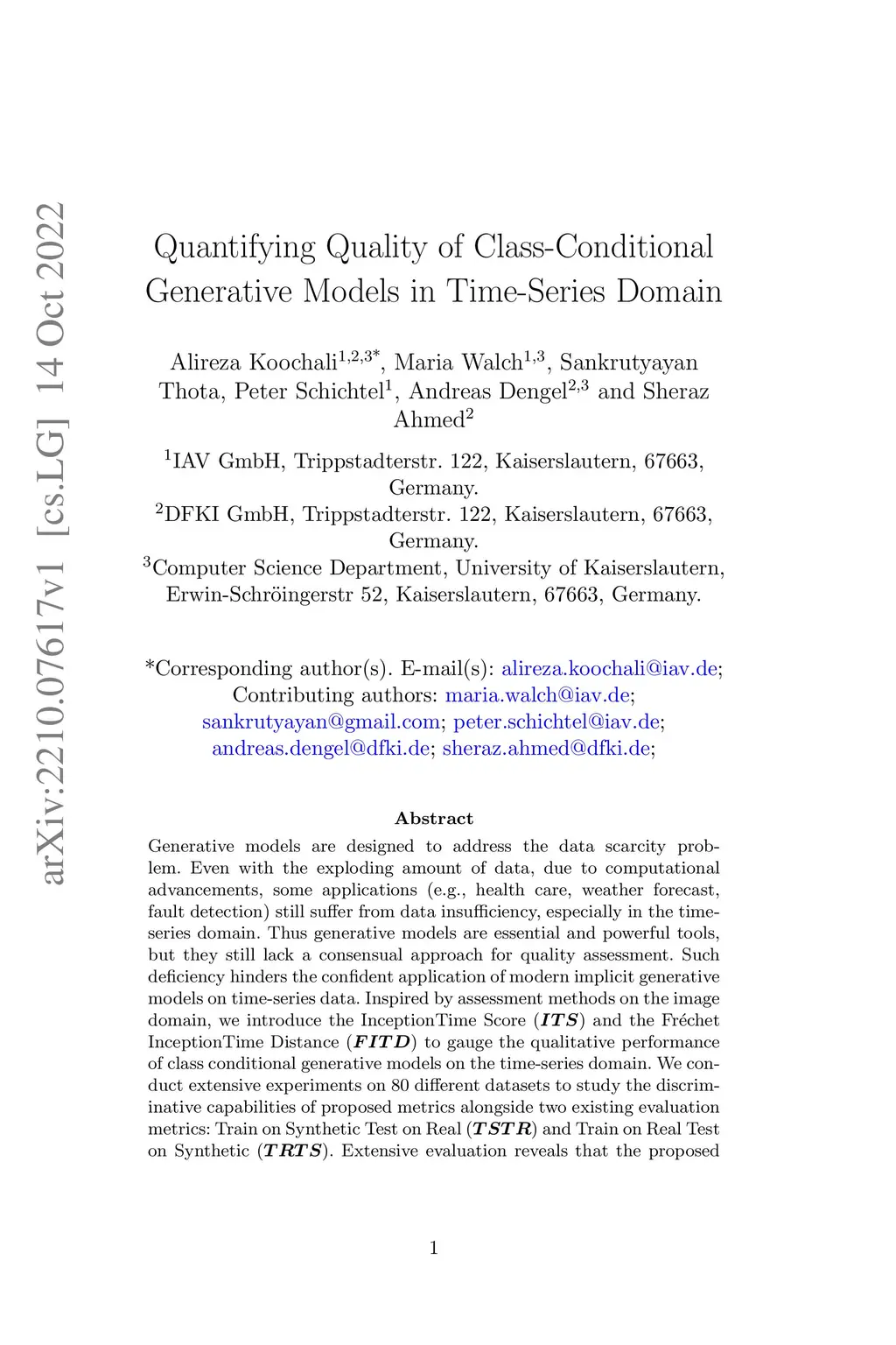 Generative models are designed to address the data scarcity problem. Even with the exploding amount of data, due to computational advancements, some applications (e.g., health care, weather forecast, fault detection) still suffer from data insufficiency, especially in the time-series domain. Thus generative models are essential and powerful tools, but they still lack a consensual approach for quality assessment. Such deficiency hinders the confident application of modern implicit generative models on time-series data. Inspired by assessment methods on the image domain, we introduce the InceptionTime Score (ITS) and the Frechet InceptionTime Distance (FITD) to gauge the qualitative performance of class conditional generative models on the time-series domain. We conduct extensive experiments on 80 different datasets to study the discriminative capabilities of proposed metrics alongside two existing evaluation metrics: Train on Synthetic Test on Real (TSTR) and Train on Real Test on Synthetic (TRTS). Extensive evaluation reveals that the proposed assessment method, i.e., ITS and FITD in combination with TSTR, can accurately assess class-conditional generative model performance.