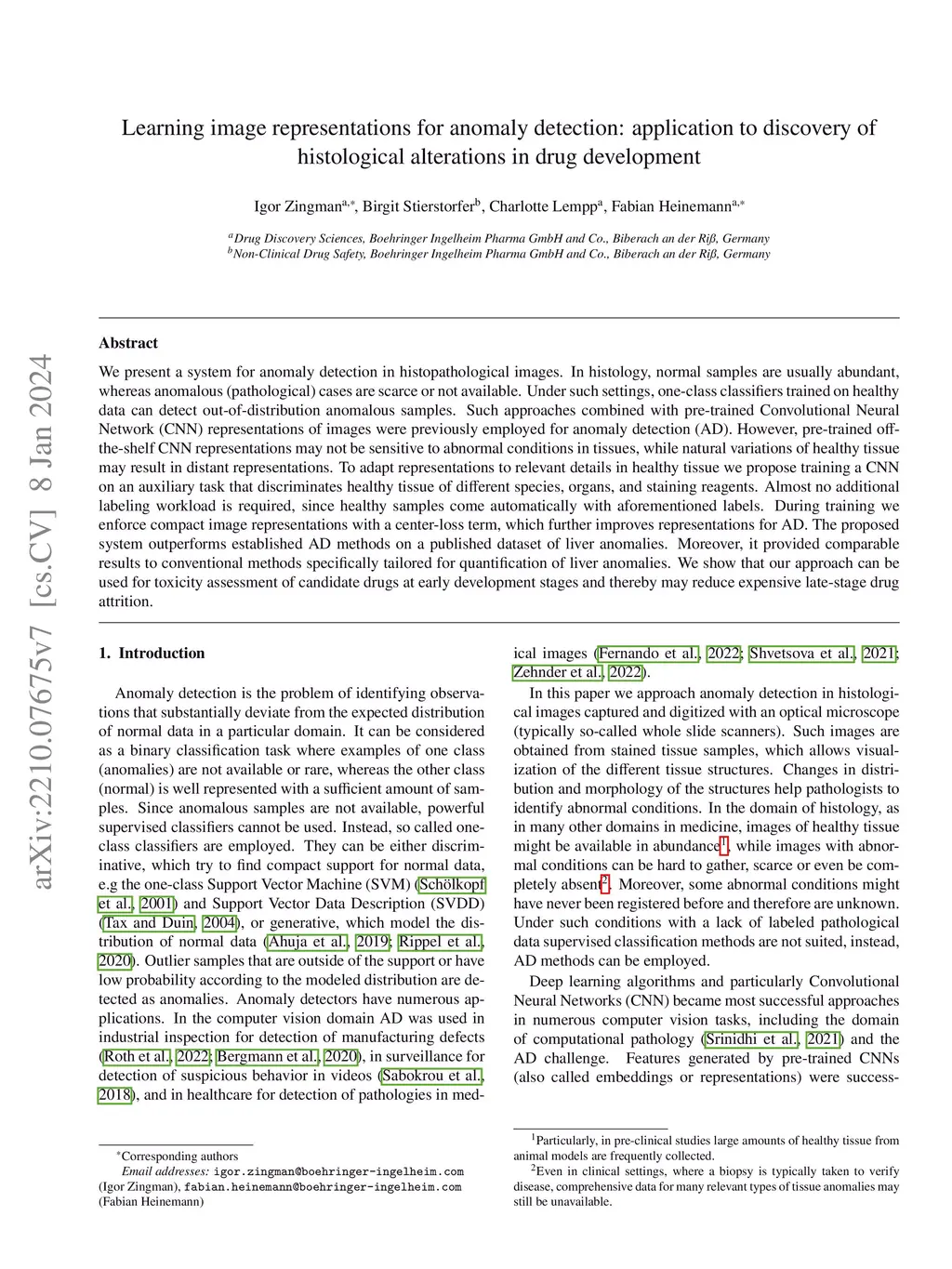 We present a system for anomaly detection in histopathological images. In histology, normal samples are usually abundant, whereas anomalous (pathological) cases are scarce or not available. Under such settings, one-class classifiers trained on healthy data can detect out-of-distribution anomalous samples. Such approaches combined with pre-trained Convolutional Neural Network (CNN) representations of images were previously employed for anomaly detection (AD). However, pre-trained off-the-shelf CNN representations may not be sensitive to abnormal conditions in tissues, while natural variations of healthy tissue may result in distant representations. To adapt representations to relevant details in healthy tissue we propose training a CNN on an auxiliary task that discriminates healthy tissue of different species, organs, and staining reagents. Almost no additional labeling workload is required, since healthy samples come automatically with aforementioned labels. During training we enforce compact image representations with a center-loss term, which further improves representations for AD. The proposed system outperforms established AD methods on a published dataset of liver anomalies. Moreover, it provided comparable results to conventional methods specifically tailored for quantification of liver anomalies. We show that our approach can be used for toxicity assessment of candidate drugs at early development stages and thereby may reduce expensive late-stage drug attrition.