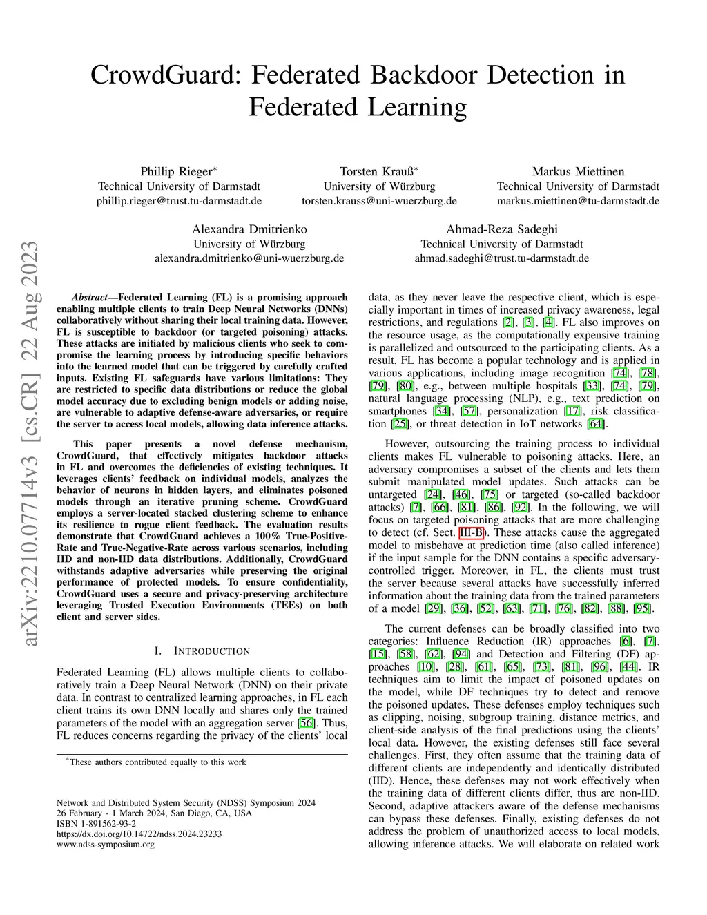 Federated Learning (FL) is a promising approach enabling multiple clients to train Deep Neural Networks (DNNs) collaboratively without sharing their local training data. However, FL is susceptible to backdoor (or targeted poisoning) attacks. These attacks are initiated by malicious clients who seek to compromise the learning process by introducing specific behaviors into the learned model that can be triggered by carefully crafted inputs. Existing FL safeguards have various limitations: They are restricted to specific data distributions or reduce the global model accuracy due to excluding benign models or adding noise, are vulnerable to adaptive defense-aware adversaries, or require the server to access local models, allowing data inference attacks. This paper presents a novel defense mechanism, CrowdGuard, that effectively mitigates backdoor attacks in FL and overcomes the deficiencies of existing techniques. It leverages clients' feedback on individual models, analyzes the behavior of neurons in hidden layers, and eliminates poisoned models through an iterative pruning scheme. CrowdGuard employs a server-located stacked clustering scheme to enhance its resilience to rogue client feedback. The evaluation results demonstrate that CrowdGuard achieves a 100% True-Positive-Rate and True-Negative-Rate across various scenarios, including IID and non-IID data distributions. Additionally, CrowdGuard withstands adaptive adversaries while preserving the original performance of protected models. To ensure confidentiality, CrowdGuard uses a secure and privacy-preserving architecture leveraging Trusted Execution Environments (TEEs) on both client and server sides.