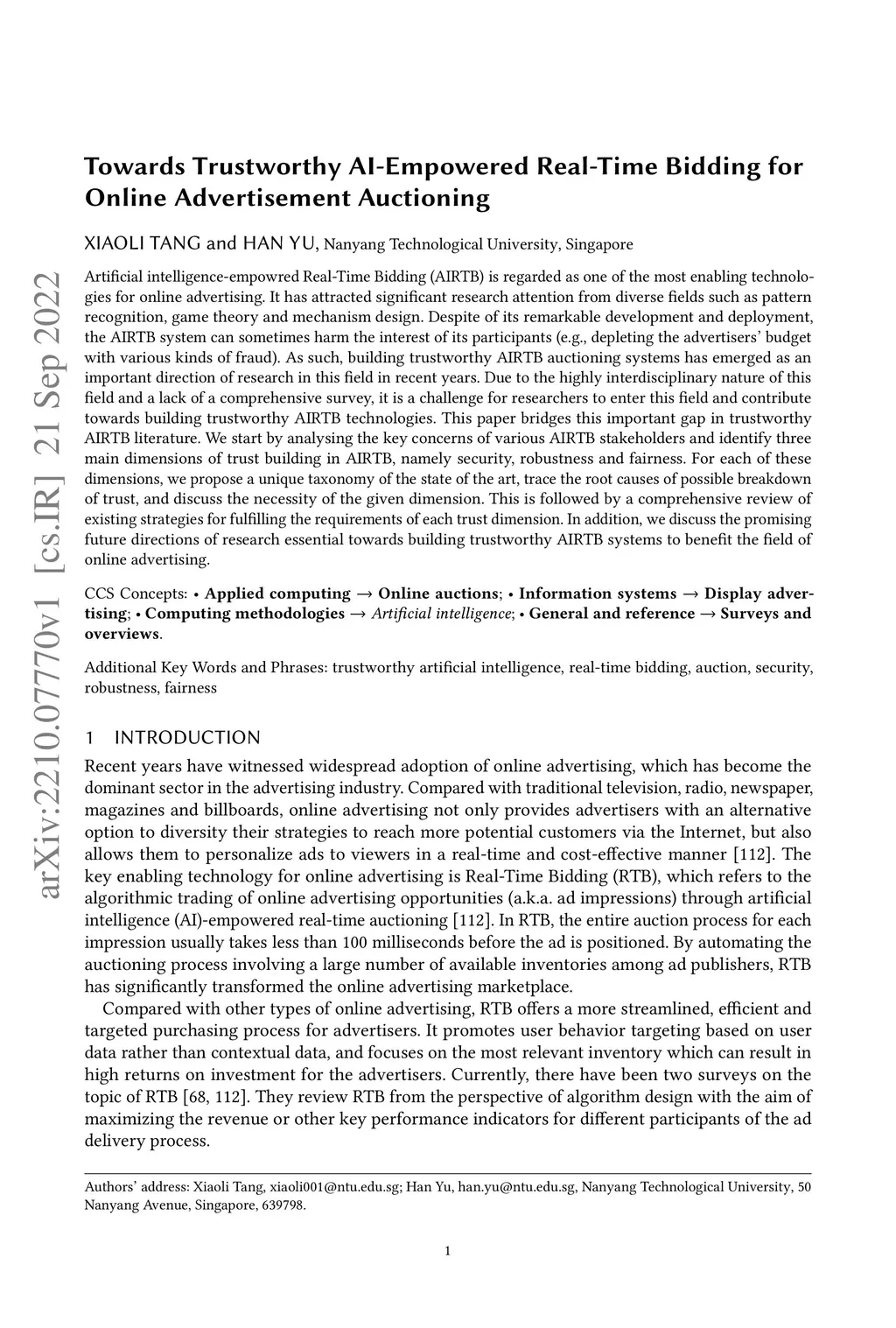 Artificial intelligence-empowred Real-Time Bidding (AIRTB) is regarded as one of the most enabling technologies for online advertising. It has attracted significant research attention from diverse fields such as pattern recognition, game theory and mechanism design. Despite of its remarkable development and deployment, the AIRTB system can sometimes harm the interest of its participants (e.g., depleting the advertisers' budget with various kinds of fraud). As such, building trustworthy AIRTB auctioning systems has emerged as an important direction of research in this field in recent years. Due to the highly interdisciplinary nature of this field and a lack of a comprehensive survey, it is a challenge for researchers to enter this field and contribute towards building trustworthy AIRTB technologies. This paper bridges this important gap in trustworthy AIRTB literature. We start by analysing the key concerns of various AIRTB stakeholders and identify three main dimensions of trust building in AIRTB, namely security, robustness and fairness. For each of these dimensions, we propose a unique taxonomy of the state of the art, trace the root causes of possible breakdown of trust, and discuss the necessity of the given dimension. This is followed by a comprehensive review of existing strategies for fulfilling the requirements of each trust dimension. In addition, we discuss the promising future directions of research essential towards building trustworthy AIRTB systems to benefit the field of online advertising.
