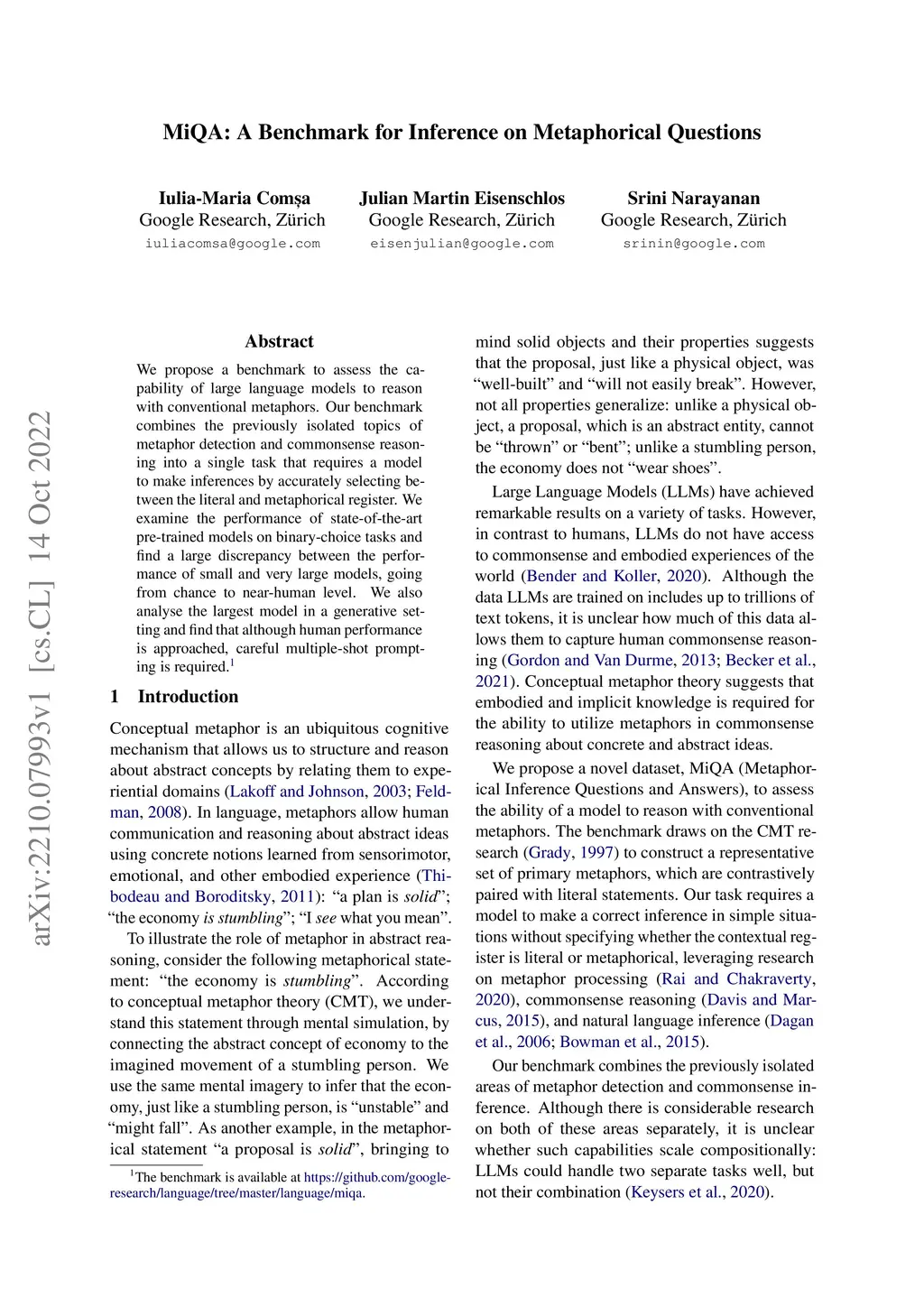 MiQA: A Benchmark for Inference on Metaphorical Questions
