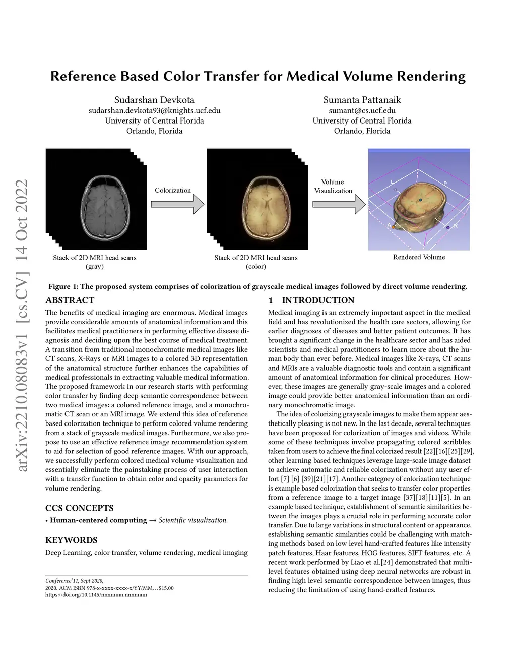 The benefits of medical imaging are enormous. Medical images provide considerable amounts of anatomical information and this facilitates medical practitioners in performing effective disease diagnosis and deciding upon the best course of medical treatment. A transition from traditional monochromatic medical images like CT scans, X-Rays or MRI images to a colored 3D representation of the anatomical structure further enhances the capabilities of medical professionals in extracting valuable medical information. The proposed framework in our research starts with performing color transfer by finding deep semantic correspondence between two medical images: a colored reference image, and a monochromatic CT scan or an MRI image. We extend this idea of reference-based colorization technique to perform colored volume rendering from a stack of grayscale medical images. Furthermore, we also propose to use an effective reference image recommendation system to aid in the selection of good reference images. With our approach, we successfully perform colored medical volume visualization and essentially eliminate the painstaking process of user interaction with a transfer function to obtain color and opacity parameters for volume rendering.