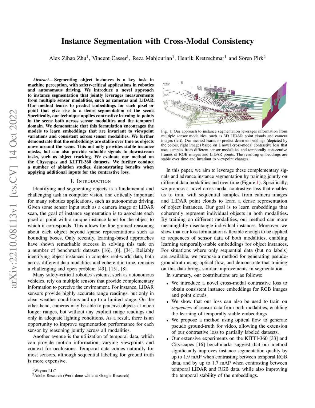 Segmenting object instances is a key task in machine perception, with safety-critical applications in robotics and autonomous driving. We introduce a novel approach to instance segmentation that jointly leverages measurements from multiple sensor modalities, such as cameras and LiDAR. Our method learns to predict embeddings for each pixel or point that give rise to a dense segmentation of the scene. Specifically, our technique applies contrastive learning to points in the scene both across sensor modalities and the temporal domain. We demonstrate that this formulation encourages the models to learn embeddings that are invariant to viewpoint variations and consistent across sensor modalities. We further demonstrate that the embeddings are stable over time as objects move around the scene. This not only provides stable instance masks, but can also provide valuable signals to downstream tasks, such as object tracking. We evaluate our method on the Cityscapes and KITTI-360 datasets. We further conduct a number of ablation studies, demonstrating benefits when applying additional inputs for the contrastive loss.
