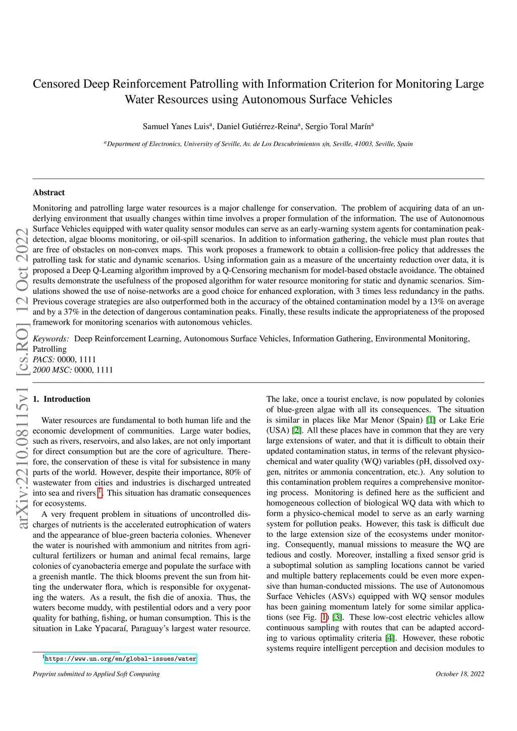 Monitoring and patrolling large water resources is a major challenge for conservation. The problem of acquiring data of an underlying environment that usually changes within time involves a proper formulation of the information. The use of Autonomous Surface Vehicles equipped with water quality sensor modules can serve as an early-warning system agents for contamination peak-detection, algae blooms monitoring, or oil-spill scenarios. In addition to information gathering, the vehicle must plan routes that are free of obstacles on non-convex maps. This work proposes a framework to obtain a collision-free policy that addresses the patrolling task for static and dynamic scenarios. Using information gain as a measure of the uncertainty reduction over data, it is proposed a Deep Q-Learning algorithm improved by a Q-Censoring mechanism for model-based obstacle avoidance. The obtained results demonstrate the usefulness of the proposed algorithm for water resource monitoring for static and dynamic scenarios. Simulations showed the use of noise-networks are a good choice for enhanced exploration, with 3 times less redundancy in the paths. Previous coverage strategies are also outperformed both in the accuracy of the obtained contamination model by a 13% on average and by a 37% in the detection of dangerous contamination peaks. Finally, these results indicate the appropriateness of the proposed framework for monitoring scenarios with autonomous vehicles.