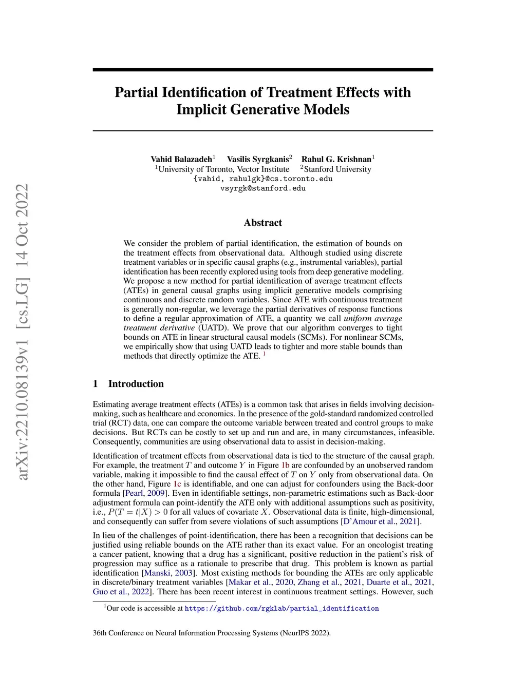 We consider the problem of partial identification, the estimation of bounds on the treatment effects from observational data. Although studied using discrete treatment variables or in specific causal graphs (e.g., instrumental variables), partial identification has been recently explored using tools from deep generative modeling. We propose a new method for partial identification of average treatment effects(ATEs) in general causal graphs using implicit generative models comprising continuous and discrete random variables. Since ATE with continuous treatment is generally non-regular, we leverage the partial derivatives of response functions to define a regular approximation of ATE, a quantity we call uniform average treatment derivative (UATD). We prove that our algorithm converges to tight bounds on ATE in linear structural causal models (SCMs). For nonlinear SCMs, we empirically show that using UATD leads to tighter and more stable bounds than methods that directly optimize the ATE.