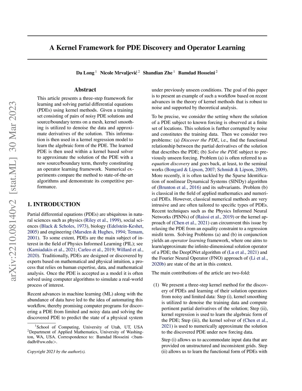 This article presents a three-step framework for learning and solving partial differential equations (PDEs) using kernel methods. Given a training set consisting of pairs of noisy PDE solutions and source/boundary terms on a mesh, kernel smoothing is utilized to denoise the data and approximate derivatives of the solution. This information is then used in a kernel regression model to learn the algebraic form of the PDE. The learned PDE is then used within a kernel based solver to approximate the solution of the PDE with a new source/boundary term, thereby constituting an operator learning framework. Numerical experiments compare the method to state-of-the-art algorithms and demonstrate its competitive performance.