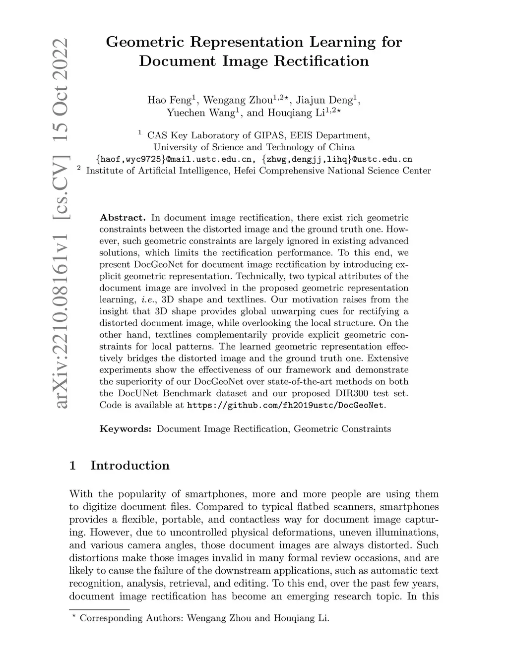 In document image rectification, there exist rich geometric constraints between the distorted image and the ground truth one. However, such geometric constraints are largely ignored in existing advanced solutions, which limits the rectification performance. To this end, we present DocGeoNet for document image rectification by introducing explicit geometric representation. Technically, two typical attributes of the document image are involved in the proposed geometric representation learning, i.e., 3D shape and textlines. Our motivation arises from the insight that 3D shape provides global unwarping cues for rectifying a distorted document image while overlooking the local structure. On the other hand, textlines complementarily provide explicit geometric constraints for local patterns. The learned geometric representation effectively bridges the distorted image and the ground truth one. Extensive experiments show the effectiveness of our framework and demonstrate the superiority of our DocGeoNet over state-of-the-art methods on both the DocUNet Benchmark dataset and our proposed DIR300 test set. The code is available at https://github.com/fh2019ustc/DocGeoNet.