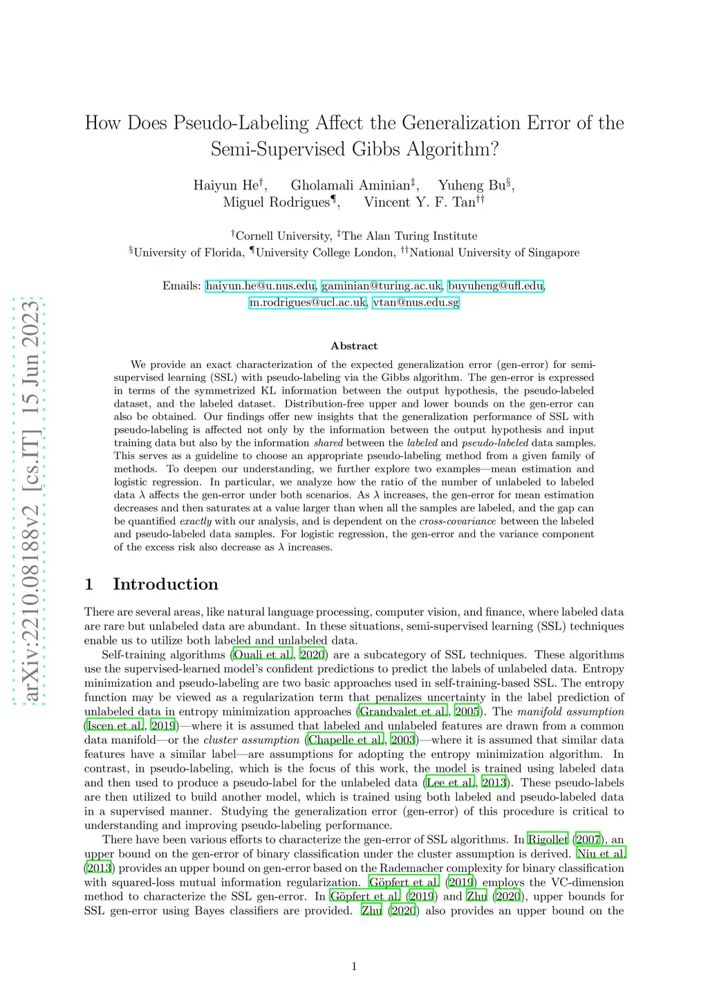 We provide an exact characterization of the expected generalization error (gen-error) for semi-supervised learning (SSL) with pseudo-labeling via the Gibbs algorithm. The gen-error is expressed in terms of the symmetrized KL information between the output hypothesis, the pseudo-labeled dataset, and the labeled dataset. Distribution-free upper and lower bounds on the gen-error can also be obtained. Our findings offer new insights that the generalization performance of SSL with pseudo-labeling is affected not only by the information between the output hypothesis and input training data but also by the information {\em shared} between the {\em labeled} and {\em pseudo-labeled} data samples. This serves as a guideline to choose an appropriate pseudo-labeling method from a given family of methods. To deepen our understanding, we further explore two examples -- mean estimation and logistic regression. In particular, we analyze how the ratio of the number of unlabeled to labeled data affects the gen-error under both scenarios. As increases, the gen-error for mean estimation decreases and then saturates at a value larger than when all the samples are labeled, and the gap can be quantified {\em exactly} with our analysis, and is dependent on the \emph{cross-covariance} between the labeled and pseudo-labeled data samples. For logistic regression, the gen-error and the variance component of the excess risk also decrease as increases.