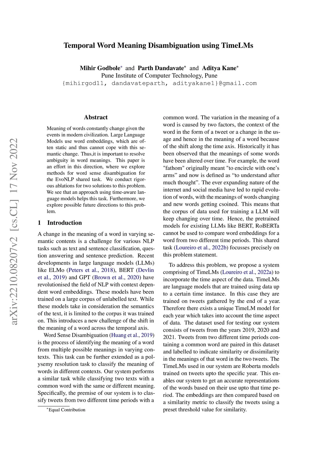 Meaning of words constantly changes given the events in modern civilization. Large Language Models use word embeddings, which are often static and thus cannot cope with this semantic change. Thus,it is important to resolve ambiguity in word meanings. This paper is an effort in this direction, where we explore methods for word sense disambiguation for the EvoNLP shared task. We conduct rigorous ablations for two solutions to this problem. We see that an approach using time-aware language models helps this task. Furthermore, we explore possible future directions to this problem.