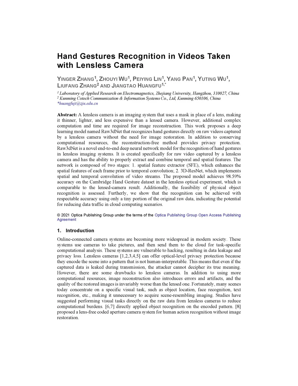 A lensless camera is an imaging system that uses a mask in place of a lens, making it thinner, lighter, and less expensive than a lensed camera. However, additional complex computation and time are required for image reconstruction. This work proposes a deep learning model named Raw3dNet that recognizes hand gestures directly on raw videos captured by a lensless camera without the need for image restoration. In addition to conserving computational resources, the reconstruction-free method provides privacy protection. Raw3dNet is a novel end-to-end deep neural network model for the recognition of hand gestures in lensless imaging systems. It is created specifically for raw video captured by a lensless camera and has the ability to properly extract and combine temporal and spatial features. The network is composed of two stages: 1. spatial feature extractor (SFE), which enhances the spatial features of each frame prior to temporal convolution; 2. 3D-ResNet, which implements spatial and temporal convolution of video streams. The proposed model achieves 98.59% accuracy on the Cambridge Hand Gesture dataset in the lensless optical experiment, which is comparable to the lensed-camera result. Additionally, the feasibility of physical object recognition is assessed. Furtherly, we show that the recognition can be achieved with respectable accuracy using only a tiny portion of the original raw data, indicating the potential for reducing data traffic in cloud computing scenarios.