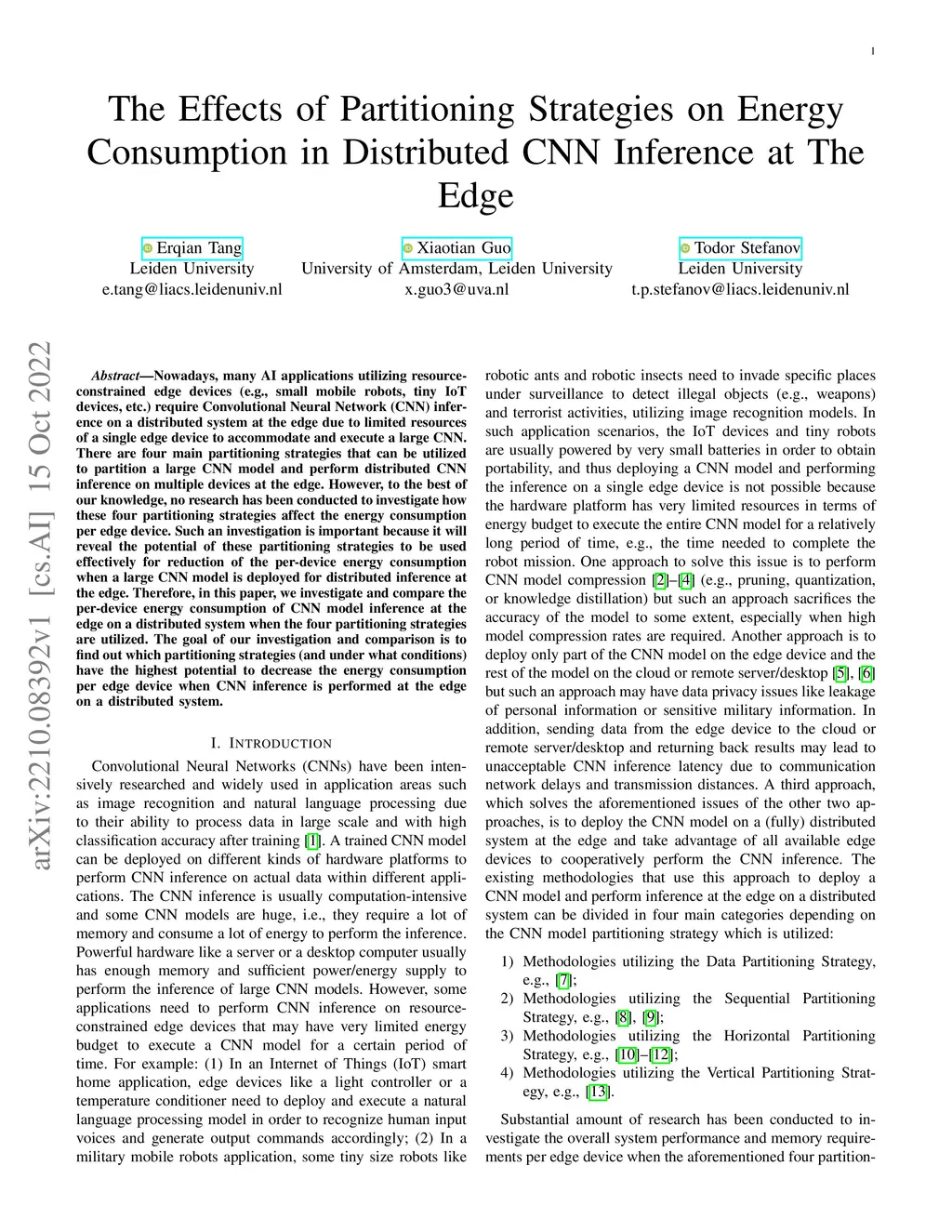Nowadays, many AI applications utilizing resource-constrained edge devices (e.g., small mobile robots, tiny IoT devices, etc.) require Convolutional Neural Network (CNN) inference on a distributed system at the edge due to limited resources of a single edge device to accommodate and execute a large CNN. There are four main partitioning strategies that can be utilized to partition a large CNN model and perform distributed CNN inference on multiple devices at the edge. However, to the best of our knowledge, no research has been conducted to investigate how these four partitioning strategies affect the energy consumption per edge device. Such an investigation is important because it will reveal the potential of these partitioning strategies to be used effectively for reduction of the per-device energy consumption when a large CNN model is deployed for distributed inference at the edge. Therefore, in this paper, we investigate and compare the per-device energy consumption of CNN model inference at the edge on a distributed system when the four partitioning strategies are utilized. The goal of our investigation and comparison is to find out which partitioning strategies (and under what conditions) have the highest potential to decrease the energy consumption per edge device when CNN inference is performed at the edge on a distributed system.
