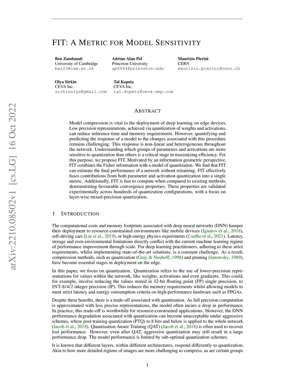 Model compression is vital to the deployment of deep learning on edge devices. Low precision representations, achieved via quantization of weights and activations, can reduce inference time and memory requirements. However, quantifying and predicting the response of a model to the changes associated with this procedure remains challenging. This response is non-linear and heterogeneous throughout the network. Understanding which groups of parameters and activations are more sensitive to quantization than others is a critical stage in maximizing efficiency. For this purpose, we propose FIT. Motivated by an information geometric perspective, FIT combines the Fisher information with a model of quantization. We find that FIT can estimate the final performance of a network without retraining. FIT effectively fuses contributions from both parameter and activation quantization into a single metric. Additionally, FIT is fast to compute when compared to existing methods, demonstrating favourable convergence properties. These properties are validated experimentally across hundreds of quantization configurations, with a focus on layer-wise mixed-precision quantization.