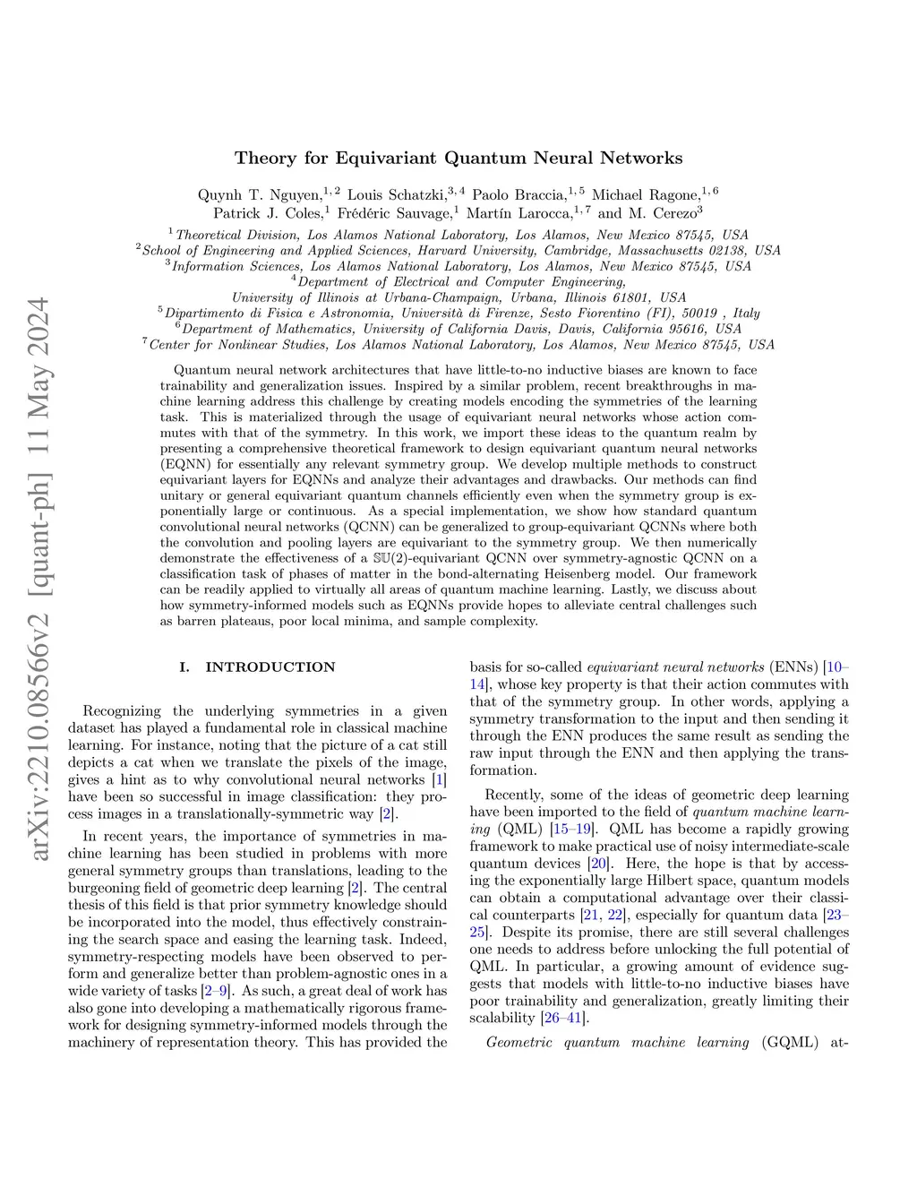 Quantum neural network architectures that have little-to-no inductive biases are known to face trainability and generalization issues. Inspired by a similar problem, recent breakthroughs in machine learning address this challenge by creating models encoding the symmetries of the learning task. This is materialized through the usage of equivariant neural networks whose action commutes with that of the symmetry. In this work, we import these ideas to the quantum realm by presenting a comprehensive theoretical framework to design equivariant quantum neural networks (EQNN) for essentially any relevant symmetry group. We develop multiple methods to construct equivariant layers for EQNNs and analyze their advantages and drawbacks. Our methods can find unitary or general equivariant quantum channels efficiently even when the symmetry group is exponentially large or continuous. As a special implementation, we show how standard quantum convolutional neural networks (QCNN) can be generalized to group-equivariant QCNNs where both the convolution and pooling layers are equivariant to the symmetry group. We then numerically demonstrate the effectiveness of a SU(2)-equivariant QCNN over symmetry-agnostic QCNN on a classification task of phases of matter in the bond-alternating Heisenberg model. Our framework can be readily applied to virtually all areas of quantum machine learning. Lastly, we discuss about how symmetry-informed models such as EQNNs provide hopes to alleviate central challenges such as barren plateaus, poor local minima, and sample complexity.