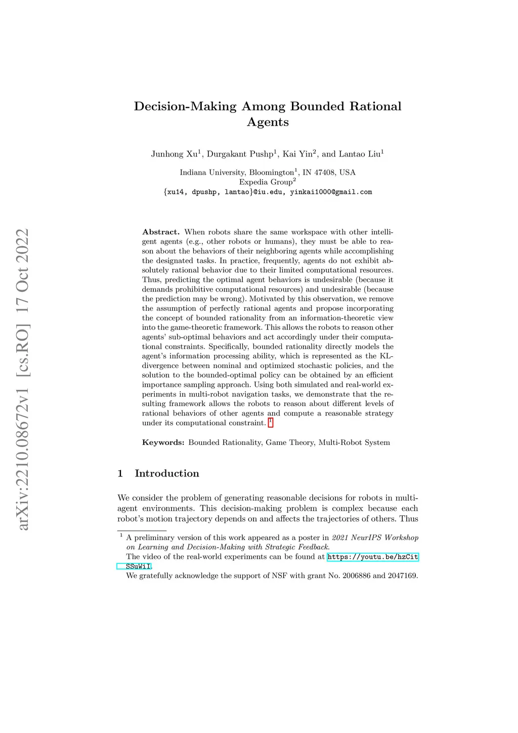 When robots share the same workspace with other intelligent agents (e.g., other robots or humans), they must be able to reason about the behaviors of their neighboring agents while accomplishing the designated tasks. In practice, frequently, agents do not exhibit absolutely rational behavior due to their limited computational resources. Thus, predicting the optimal agent behaviors is undesirable (because it demands prohibitive computational resources) and undesirable (because the prediction may be wrong). Motivated by this observation, we remove the assumption of perfectly rational agents and propose incorporating the concept of bounded rationality from an information-theoretic view into the game-theoretic framework. This allows the robots to reason other agents' sub-optimal behaviors and act accordingly under their computational constraints. Specifically, bounded rationality directly models the agent's information processing ability, which is represented as the KL-divergence between nominal and optimized stochastic policies, and the solution to the bounded-optimal policy can be obtained by an efficient importance sampling approach. Using both simulated and real-world experiments in multi-robot navigation tasks, we demonstrate that the resulting framework allows the robots to reason about different levels of rational behaviors of other agents and compute a reasonable strategy under its computational constraint.
