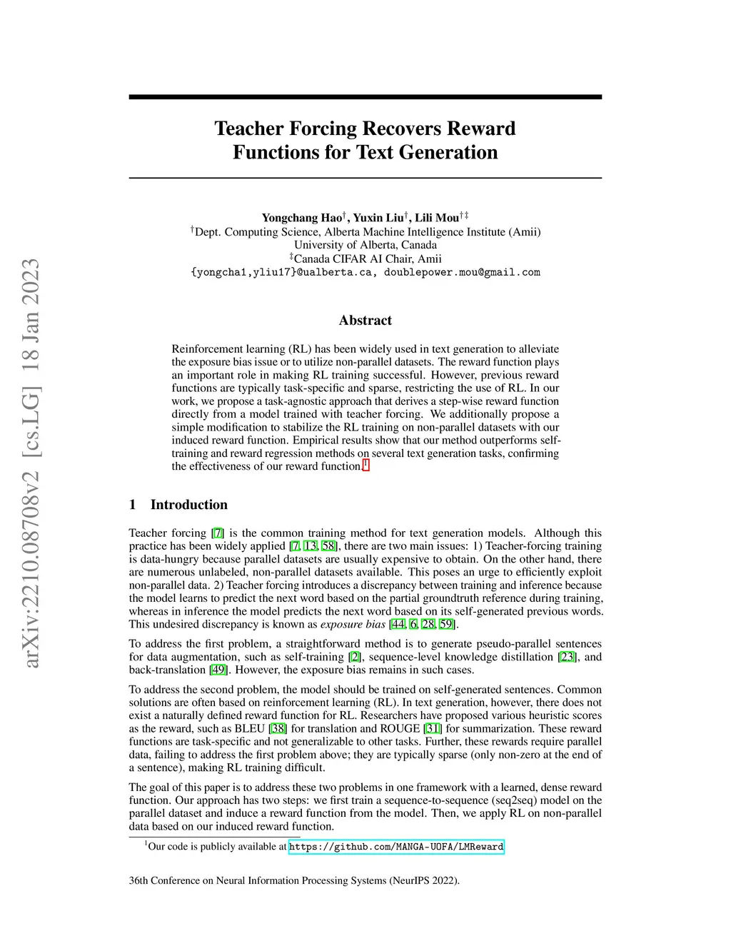 Reinforcement learning (RL) has been widely used in text generation to alleviate the exposure bias issue or to utilize non-parallel datasets. The reward function plays an important role in making RL training successful. However, previous reward functions are typically task-specific and sparse, restricting the use of RL. In our work, we propose a task-agnostic approach that derives a step-wise reward function directly from a model trained with teacher forcing. We additionally propose a simple modification to stabilize the RL training on non-parallel datasets with our induced reward function. Empirical results show that our method outperforms self-training and reward regression methods on several text generation tasks, confirming the effectiveness of our reward function.