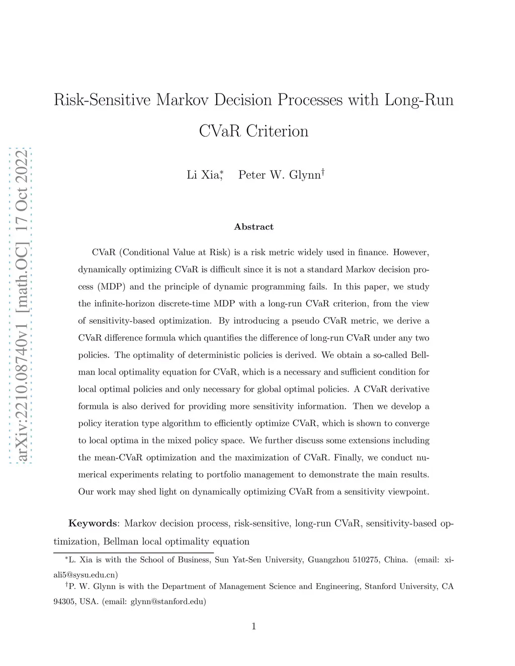 CVaR (Conditional Value at Risk) is a risk metric widely used in finance. However, dynamically optimizing CVaR is difficult since it is not a standard Markov decision process (MDP) and the principle of dynamic programming fails. In this paper, we study the infinite-horizon discrete-time MDP with a long-run CVaR criterion, from the view of sensitivity-based optimization. By introducing a pseudo CVaR metric, we derive a CVaR difference formula which quantifies the difference of long-run CVaR under any two policies. The optimality of deterministic policies is derived. We obtain a so-called Bellman local optimality equation for CVaR, which is a necessary and sufficient condition for local optimal policies and only necessary for global optimal policies. A CVaR derivative formula is also derived for providing more sensitivity information. Then we develop a policy iteration type algorithm to efficiently optimize CVaR, which is shown to converge to local optima in the mixed policy space. We further discuss some extensions including the mean-CVaR optimization and the maximization of CVaR. Finally, we conduct numerical experiments relating to portfolio management to demonstrate the main results. Our work may shed light on dynamically optimizing CVaR from a sensitivity viewpoint.