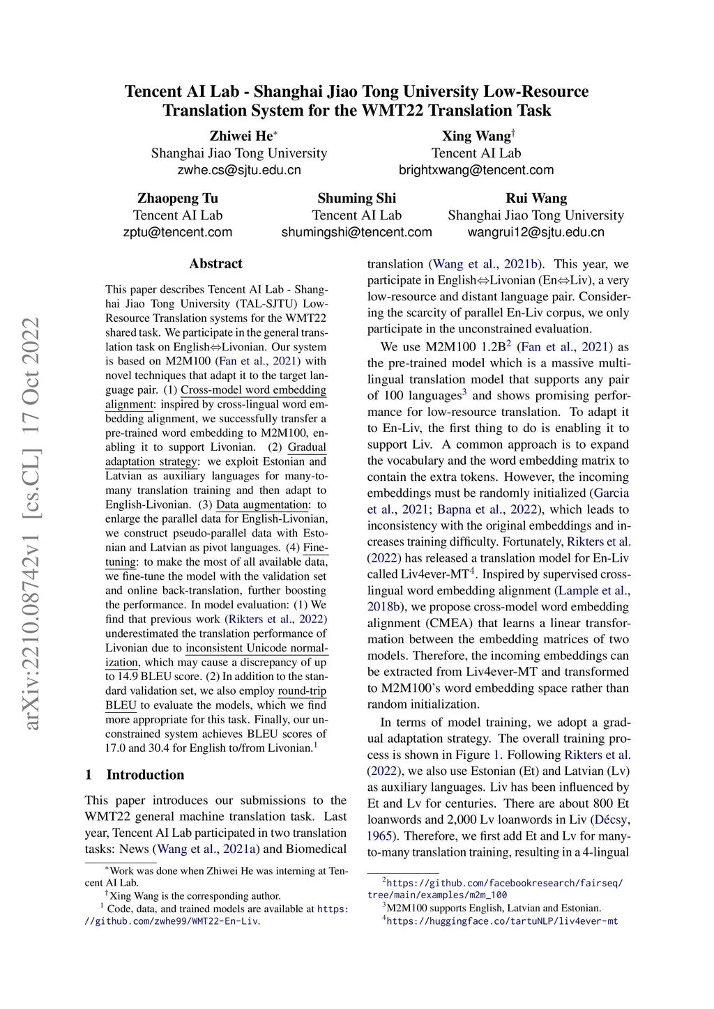 This paper describes Tencent AI Lab - Shanghai Jiao Tong University (TAL-SJTU) Low-Resource Translation systems for the WMT22 shared task. We participate in the general translation task on EnglishLivonian. Our system is based on M2M100 with novel techniques that adapt it to the target language pair. (1) Cross-model word embedding alignment: inspired by cross-lingual word embedding alignment, we successfully transfer a pre-trained word embedding to M2M100, enabling it to support Livonian. (2) Gradual adaptation strategy: we exploit Estonian and Latvian as auxiliary languages for many-to-many translation training and then adapt to English-Livonian. (3) Data augmentation: to enlarge the parallel data for English-Livonian, we construct pseudo-parallel data with Estonian and Latvian as pivot languages. (4) Fine-tuning: to make the most of all available data, we fine-tune the model with the validation set and online back-translation, further boosting the performance. In model evaluation: (1) We find that previous work underestimated the translation performance of Livonian due to inconsistent Unicode normalization, which may cause a discrepancy of up to 14.9 BLEU score. (2) In addition to the standard validation set, we also employ round-trip BLEU to evaluate the models, which we find more appropriate for this task. Finally, our unconstrained system achieves BLEU scores of 17.0 and 30.4 for English to/from Livonian.
