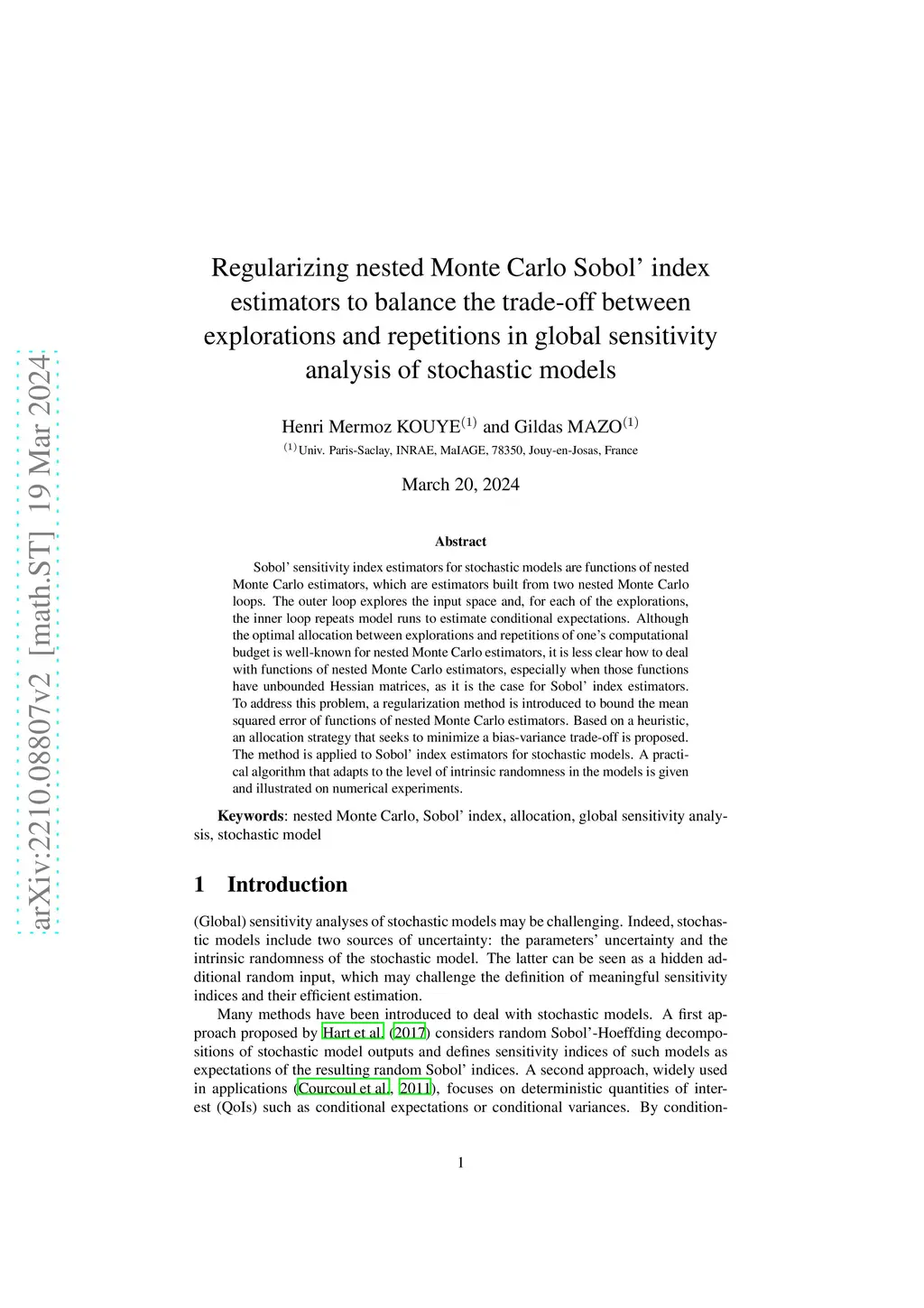 Sobol' sensitivity index estimators for stochastic models are functions of nested Monte Carlo estimators, which are estimators built from two nested Monte Carlo loops. The outer loop explores the input space and, for each of the explorations, the inner loop repeats model runs to estimate conditional expectations. Although the optimal allocation between explorations and repetitions of one's computational budget is well-known for nested Monte Carlo estimators, it is less clear how to deal with functions of nested Monte Carlo estimators, especially when those functions have unbounded Hessian matrices, as it is the case for Sobol' index estimators. To address this problem, a regularization method is introduced to bound the mean squared error of functions of nested Monte Carlo estimators. Based on a heuristic, an allocation strategy that seeks to minimize a bias-variance trade-off is proposed. The method is applied to Sobol' index estimators for stochastic models. A practical algorithm that adapts to the level of intrinsic randomness in the models is given and illustrated on numerical experiments.