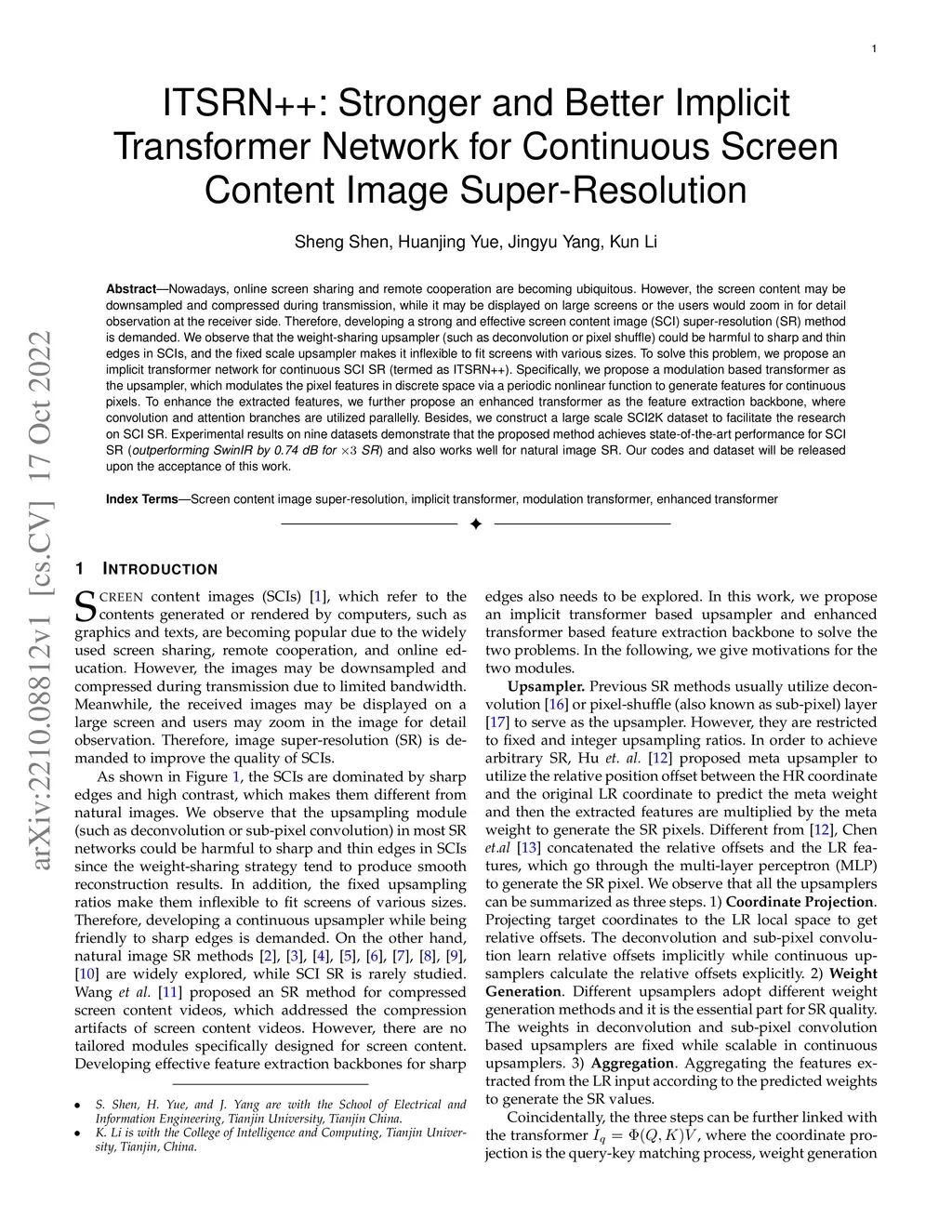 Nowadays, online screen sharing and remote cooperation are becoming ubiquitous. However, the screen content may be downsampled and compressed during transmission, while it may be displayed on large screens or the users would zoom in for detail observation at the receiver side. Therefore, developing a strong and effective screen content image (SCI) super-resolution (SR) method is demanded. We observe that the weight-sharing upsampler (such as deconvolution or pixel shuffle) could be harmful to sharp and thin edges in SCIs, and the fixed scale upsampler makes it inflexible to fit screens with various sizes. To solve this problem, we propose an implicit transformer network for continuous SCI SR (termed as ITSRN++). Specifically, we propose a modulation based transformer as the upsampler, which modulates the pixel features in discrete space via a periodic nonlinear function to generate features for continuous pixels. To enhance the extracted features, we further propose an enhanced transformer as the feature extraction backbone, where convolution and attention branches are utilized parallelly. Besides, we construct a large scale SCI2K dataset to facilitate the research on SCI SR. Experimental results on nine datasets demonstrate that the proposed method achieves state-of-the-art performance for SCI SR (outperforming SwinIR by 0.74 dB for x3 SR) and also works well for natural image SR. Our codes and dataset will be released upon the acceptance of this work.