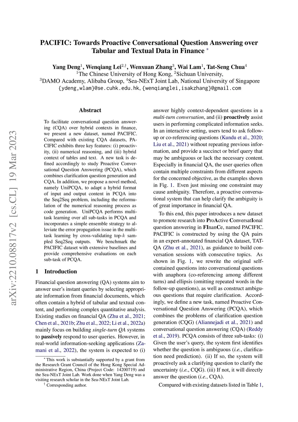 To facilitate conversational question answering (CQA) over hybrid contexts in finance, we present a new dataset, named PACIFIC. Compared with existing CQA datasets, PACIFIC exhibits three key features: (i) proactivity, (ii) numerical reasoning, and (iii) hybrid context of tables and text. A new task is defined accordingly to study Proactive Conversational Question Answering (PCQA), which combines clarification question generation and CQA. In addition, we propose a novel method, namely UniPCQA, to adapt a hybrid format of input and output content in PCQA into the Seq2Seq problem, including the reformulation of the numerical reasoning process as code generation. UniPCQA performs multi-task learning over all sub-tasks in PCQA and incorporates a simple ensemble strategy to alleviate the error propagation issue in the multi-task learning by cross-validating top- sampled Seq2Seq outputs. We benchmark the PACIFIC dataset with extensive baselines and provide comprehensive evaluations on each sub-task of PCQA.