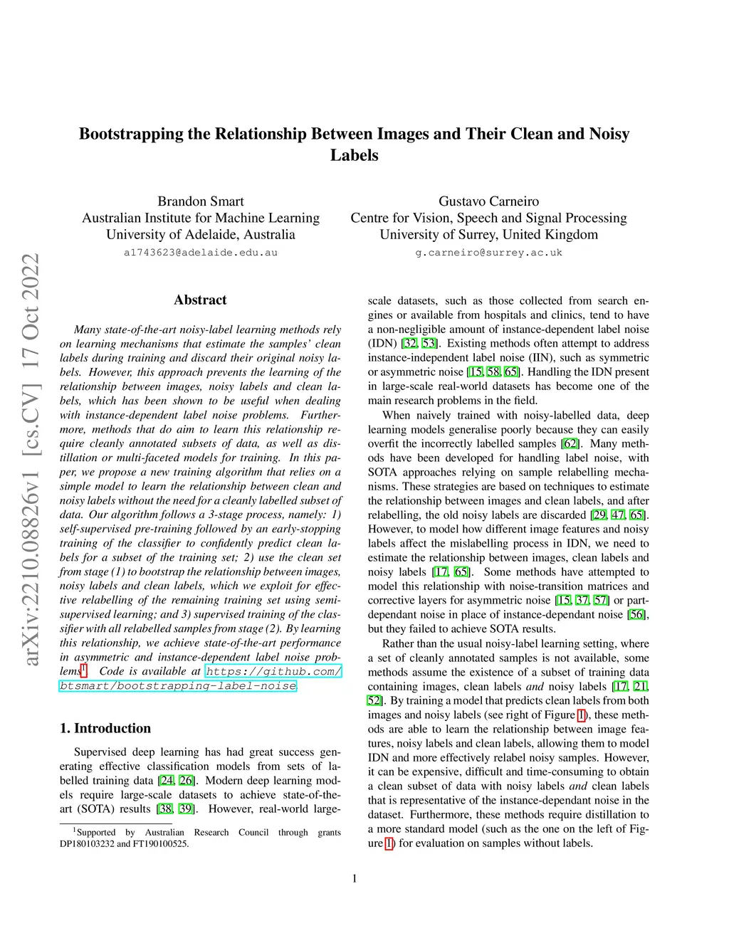 Many state-of-the-art noisy-label learning methods rely on learning mechanisms that estimate the samples' clean labels during training and discard their original noisy labels. However, this approach prevents the learning of the relationship between images, noisy labels and clean labels, which has been shown to be useful when dealing with instance-dependent label noise problems. Furthermore, methods that do aim to learn this relationship require cleanly annotated subsets of data, as well as distillation or multi-faceted models for training. In this paper, we propose a new training algorithm that relies on a simple model to learn the relationship between clean and noisy labels without the need for a cleanly labelled subset of data. Our algorithm follows a 3-stage process, namely: 1) self-supervised pre-training followed by an early-stopping training of the classifier to confidently predict clean labels for a subset of the training set; 2) use the clean set from stage (1) to bootstrap the relationship between images, noisy labels and clean labels, which we exploit for effective relabelling of the remaining training set using semi-supervised learning; and 3) supervised training of the classifier with all relabelled samples from stage (2). By learning this relationship, we achieve state-of-the-art performance in asymmetric and instance-dependent label noise problems.