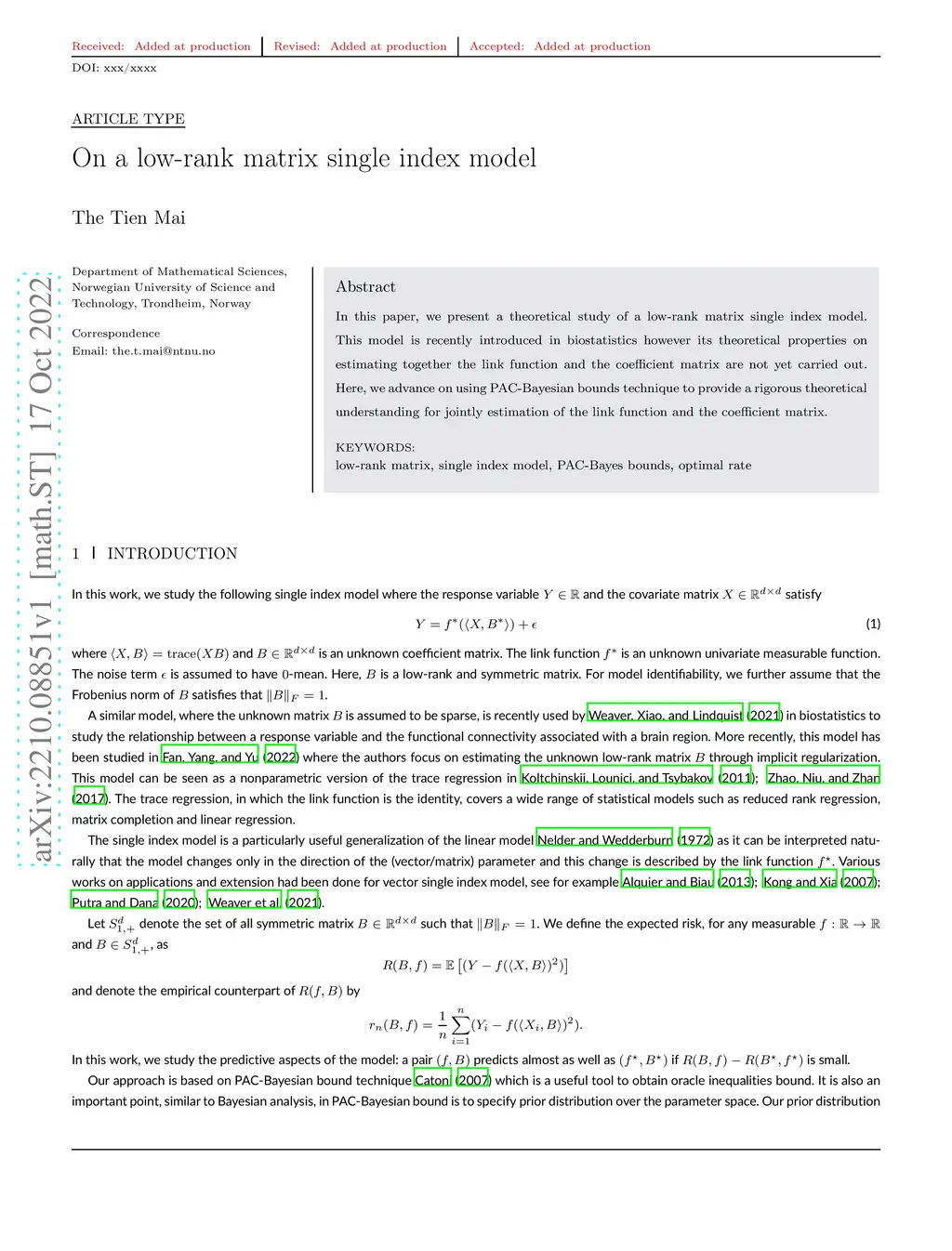 In this paper, we present a theoretical study of a low-rank matrix single index model. This model is recently introduced in biostatistics however its theoretical properties on estimating together the link function and the coefficient matrix are not yet carried out. Here, we advance on using PAC-Bayesian bounds technique to provide a rigorous theoretical understanding for jointly estimation of the link function and the coefficient matrix.