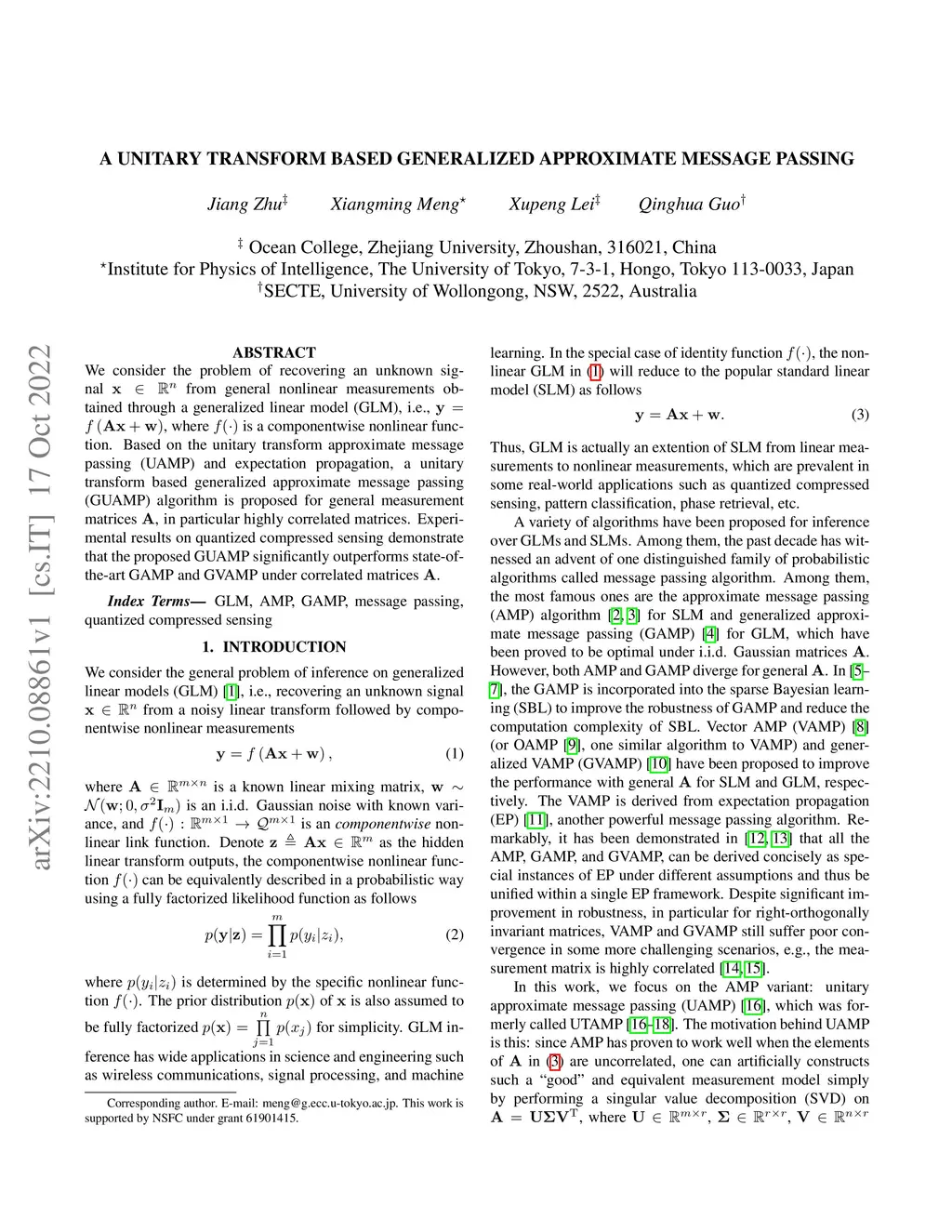 We consider the problem of recovering an unknown signal from general nonlinear measurements obtained through a generalized linear model (GLM), i.e., , where is a componentwise nonlinear function. Based on the unitary transform approximate message passing (UAMP) and expectation propagation, a unitary transform based generalized approximate message passing (GUAMP) algorithm is proposed for general measurement matrices , in particular highly correlated matrices. Experimental results on quantized compressed sensing demonstrate that the proposed GUAMP significantly outperforms state-of-the-art GAMP and GVAMP under correlated matrices .