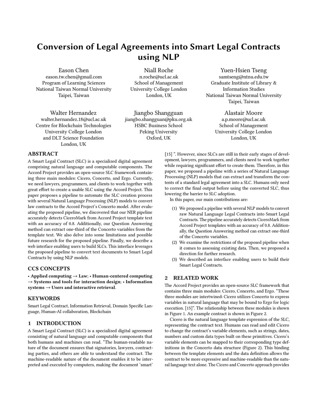 A Smart Legal Contract (SLC) is a specialized digital agreement comprising natural language and computable components. The Accord Project provides an open-source SLC framework containing three main modules: Cicero, Concerto, and Ergo. Currently, we need lawyers, programmers, and clients to work together with great effort to create a usable SLC using the Accord Project. This paper proposes a pipeline to automate the SLC creation process with several Natural Language Processing (NLP) models to convert law contracts to the Accord Project's Concerto model. After evaluating the proposed pipeline, we discovered that our NER pipeline accurately detects CiceroMark from Accord Project template text with an accuracy of 0.8. Additionally, our Question Answering method can extract one-third of the Concerto variables from the template text. We also delve into some limitations and possible future research for the proposed pipeline. Finally, we describe a web interface enabling users to build SLCs. This interface leverages the proposed pipeline to convert text documents to Smart Legal Contracts by using NLP models.
