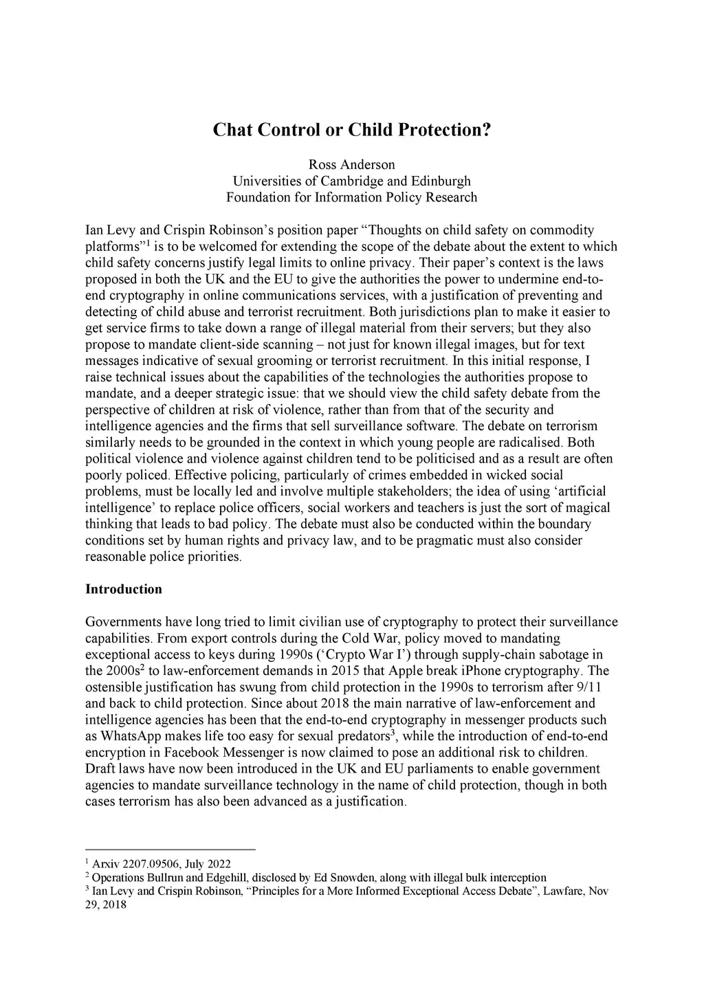 Ian Levy and Crispin Robinson's position paper "Thoughts on child safety on commodity platforms" is to be welcomed for extending the scope of the debate about the extent to which child safety concerns justify legal limits to online privacy. Their paper's context is the laws proposed in both the UK and the EU to give the authorities the power to undermine end-to-end cryptography in online communications services, with a justification of preventing and detecting of child abuse and terrorist recruitment. Both jurisdictions plan to make it easier to get service firms to take down a range of illegal material from their servers; but they also propose to mandate client-side scanning - not just for known illegal images, but for text messages indicative of sexual grooming or terrorist recruitment. In this initial response, I raise technical issues about the capabilities of the technologies the authorities propose to mandate, and a deeper strategic issue: that we should view the child safety debate from the perspective of children at risk of violence, rather than from that of the security and intelligence agencies and the firms that sell surveillance software. The debate on terrorism similarly needs to be grounded in the context in which young people are radicalised. Both political violence and violence against children tend to be politicised and as a result are often poorly policed. Effective policing, particularly of crimes embedded in wicked social problems, must be locally led and involve multiple stakeholders; the idea of using ártificial intelligence' to replace police officers, social workers and teachers is just the sort of magical thinking that leads to bad policy. The debate must also be conducted within the boundary conditions set by human rights and privacy law, and to be pragmatic must also consider reasonable police priorities.