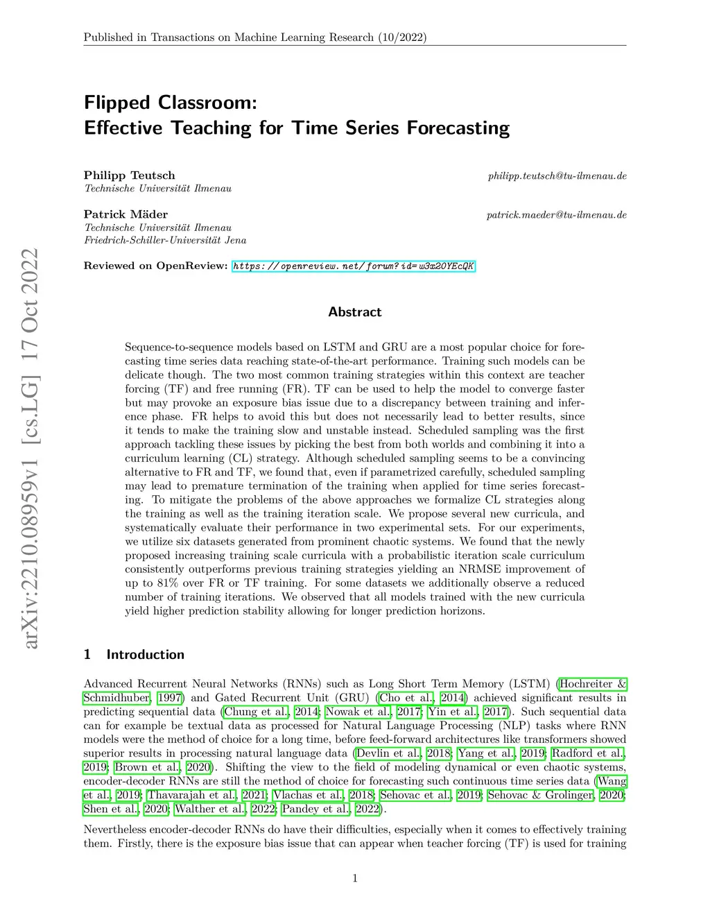 Sequence-to-sequence models based on LSTM and GRU are a most popular choice for forecasting time series data reaching state-of-the-art performance. Training such models can be delicate though. The two most common training strategies within this context are teacher forcing (TF) and free running (FR). TF can be used to help the model to converge faster but may provoke an exposure bias issue due to a discrepancy between training and inference phase. FR helps to avoid this but does not necessarily lead to better results, since it tends to make the training slow and unstable instead. Scheduled sampling was the first approach tackling these issues by picking the best from both worlds and combining it into a curriculum learning (CL) strategy. Although scheduled sampling seems to be a convincing alternative to FR and TF, we found that, even if parametrized carefully, scheduled sampling may lead to premature termination of the training when applied for time series forecasting. To mitigate the problems of the above approaches we formalize CL strategies along the training as well as the training iteration scale. We propose several new curricula, and systematically evaluate their performance in two experimental sets. For our experiments, we utilize six datasets generated from prominent chaotic systems. We found that the newly proposed increasing training scale curricula with a probabilistic iteration scale curriculum consistently outperforms previous training strategies yielding an NRMSE improvement of up to 81% over FR or TF training. For some datasets we additionally observe a reduced number of training iterations. We observed that all models trained with the new curricula yield higher prediction stability allowing for longer prediction horizons.