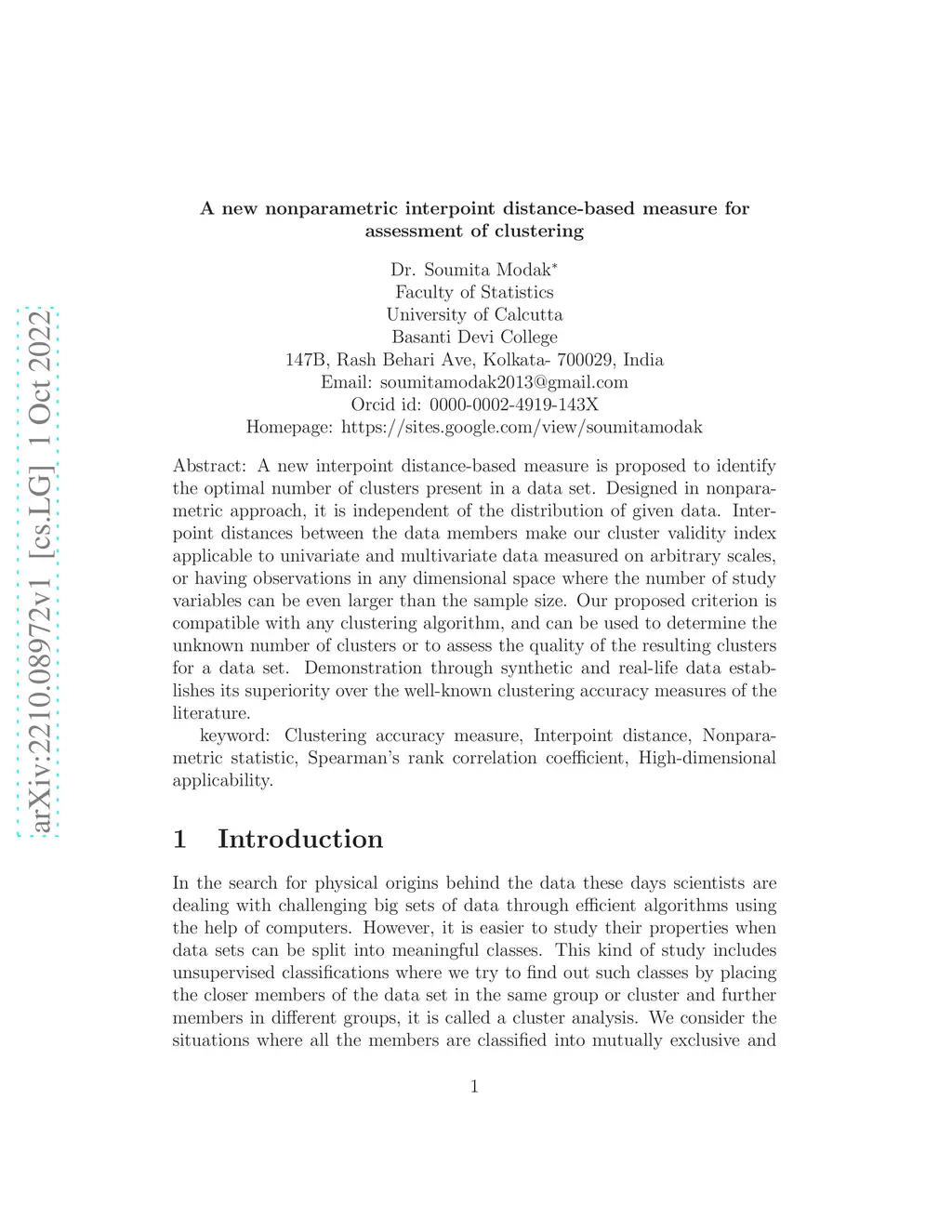 A new interpoint distance-based measure is proposed to identify the optimal number of clusters present in a data set. Designed in nonparametric approach, it is independent of the distribution of given data. Interpoint distances between the data members make our cluster validity index applicable to univariate and multivariate data measured on arbitrary scales, or having observations in any dimensional space where the number of study variables can be even larger than the sample size. Our proposed criterion is compatible with any clustering algorithm, and can be used to determine the unknown number of clusters or to assess the quality of the resulting clusters for a data set. Demonstration through synthetic and real-life data establishes its superiority over the well-known clustering accuracy measures of the literature.