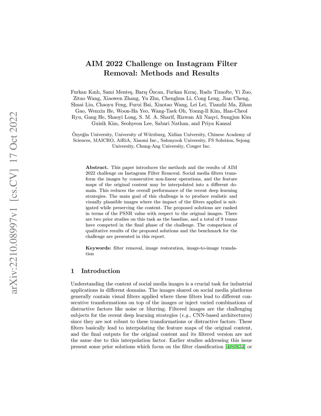 AIM 2022 Challenge on Instagram Filter Removal: Methods and Results