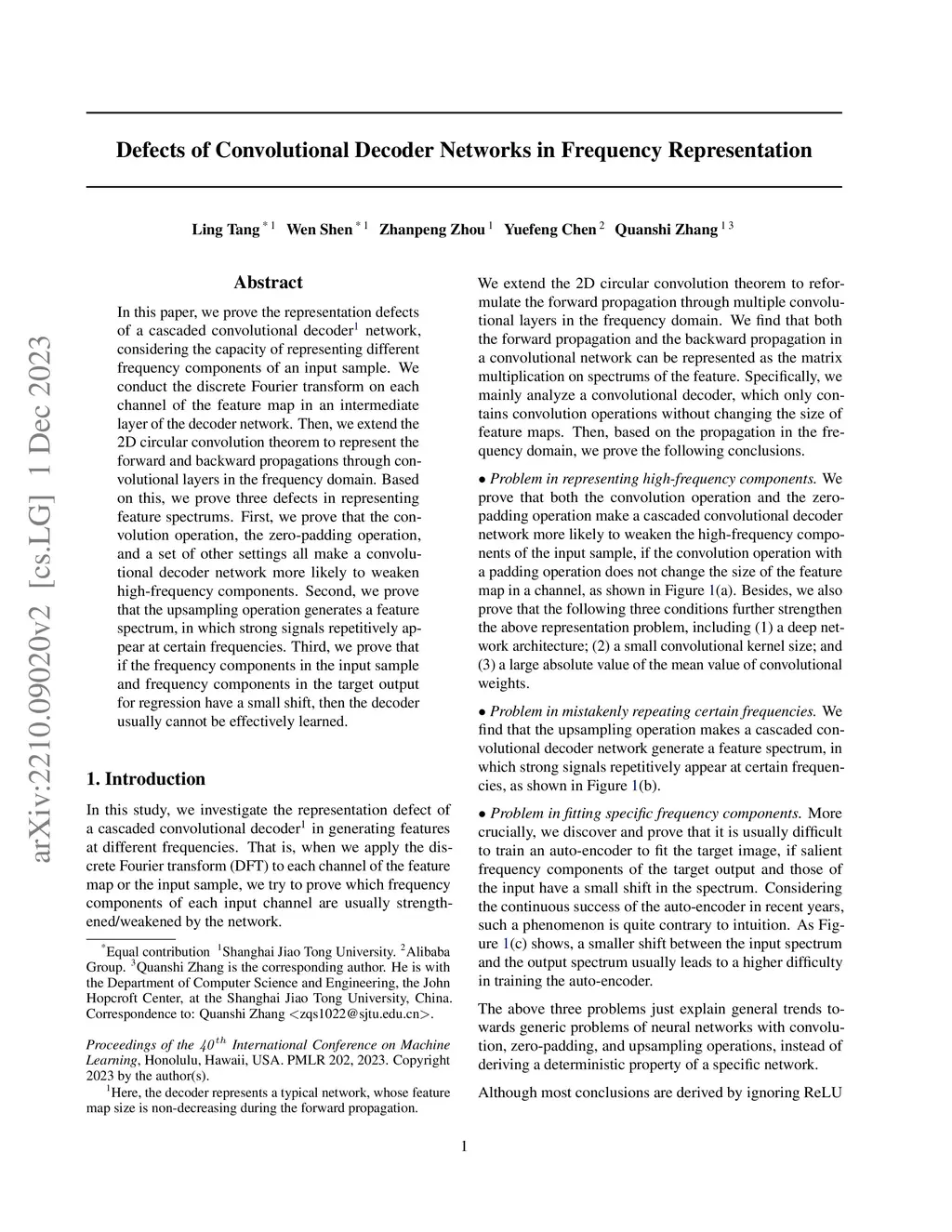 In this paper, we prove the representation defects of a cascaded convolutional decoder network, considering the capacity of representing different frequency components of an input sample. We conduct the discrete Fourier transform on each channel of the feature map in an intermediate layer of the decoder network. Then, we extend the 2D circular convolution theorem to represent the forward and backward propagations through convolutional layers in the frequency domain. Based on this, we prove three defects in representing feature spectrums. First, we prove that the convolution operation, the zero-padding operation, and a set of other settings all make a convolutional decoder network more likely to weaken high-frequency components. Second, we prove that the upsampling operation generates a feature spectrum, in which strong signals repetitively appear at certain frequencies. Third, we prove that if the frequency components in the input sample and frequency components in the target output for regression have a small shift, then the decoder usually cannot be effectively learned.