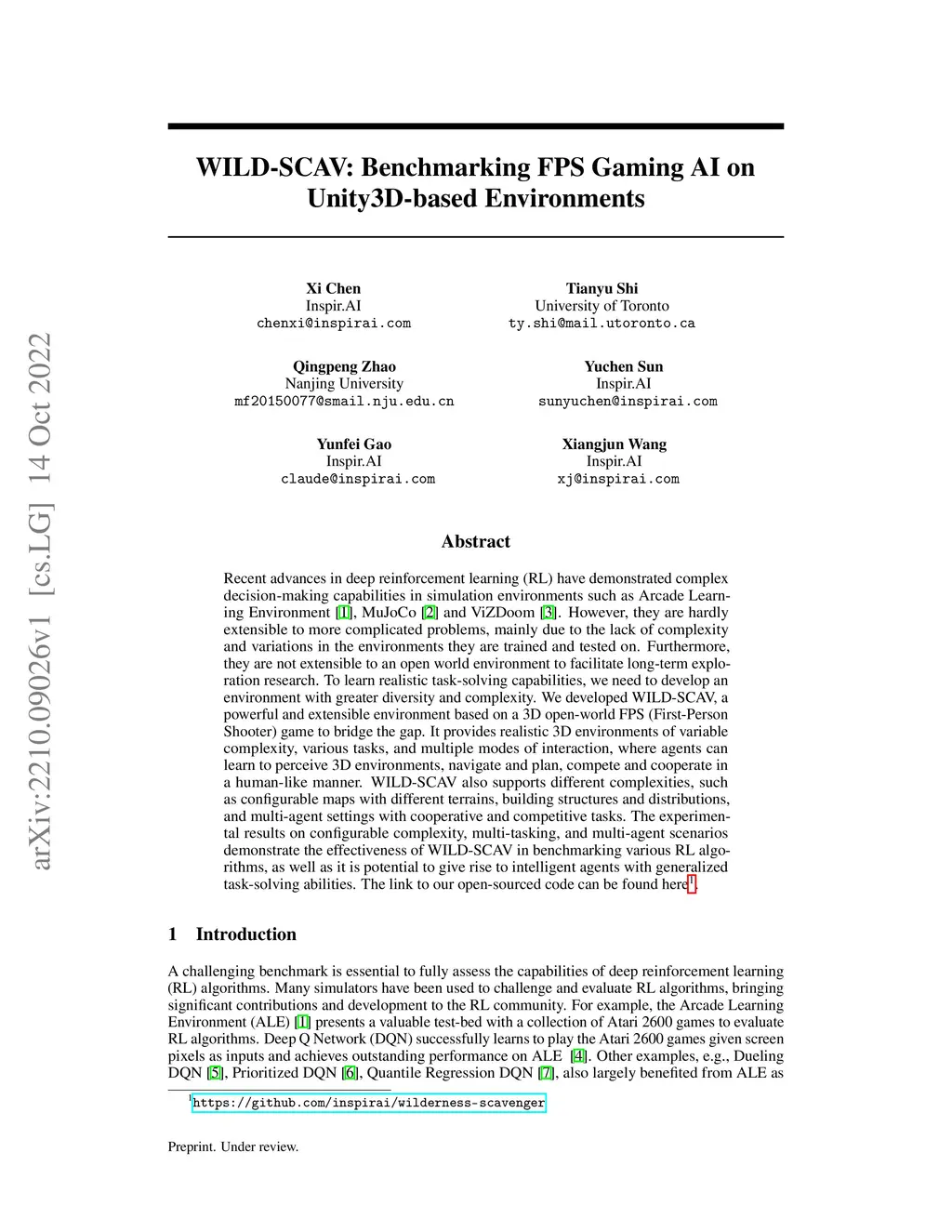 WILD-SCAV: Benchmarking FPS Gaming AI on Unity3D-based Environments