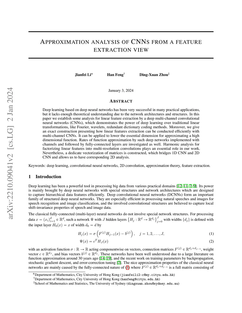 Deep learning based on deep neural networks has been very successful in many practical applications, but it lacks enough theoretical understanding due to the network architectures and structures. In this paper we establish some analysis for linear feature extraction by a deep multi-channel convolutional neural networks (CNNs), which demonstrates the power of deep learning over traditional linear transformations, like Fourier, wavelets, redundant dictionary coding methods. Moreover, we give an exact construction presenting how linear features extraction can be conducted efficiently with multi-channel CNNs. It can be applied to lower the essential dimension for approximating a high dimensional function. Rates of function approximation by such deep networks implemented with channels and followed by fully-connected layers are investigated as well. Harmonic analysis for factorizing linear features into multi-resolution convolutions plays an essential role in our work. Nevertheless, a dedicate vectorization of matrices is constructed, which bridges 1D CNN and 2D CNN and allows us to have corresponding 2D analysis.