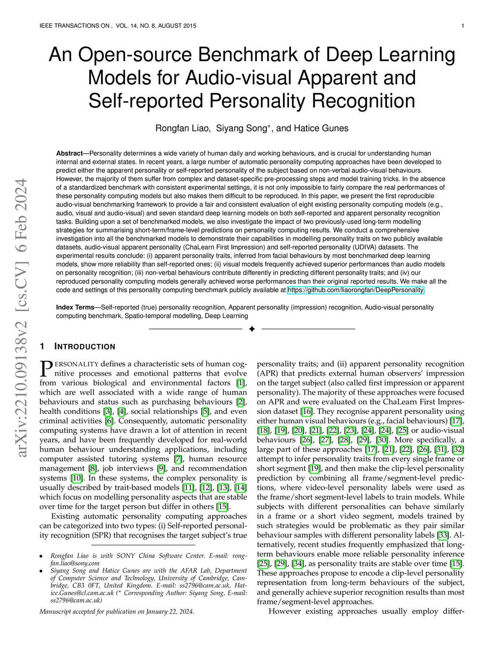 Personality determines a wide variety of human daily and working behaviours, and is crucial for understanding human internal and external states. In recent years, a large number of automatic personality computing approaches have been developed to predict either the apparent personality or self-reported personality of the subject based on non-verbal audio-visual behaviours. However, the majority of them suffer from complex and dataset-specific pre-processing steps and model training tricks. In the absence of a standardized benchmark with consistent experimental settings, it is not only impossible to fairly compare the real performances of these personality computing models but also makes them difficult to be reproduced. In this paper, we present the first reproducible audio-visual benchmarking framework to provide a fair and consistent evaluation of eight existing personality computing models (e.g., audio, visual and audio-visual) and seven standard deep learning models on both self-reported and apparent personality recognition tasks. Building upon a set of benchmarked models, we also investigate the impact of two previously-used long-term modelling strategies for summarising short-term/frame-level predictions on personality computing results. The results conclude: (i) apparent personality traits, inferred from facial behaviours by most benchmarked deep learning models, show more reliability than self-reported ones; (ii) visual models frequently achieved superior performances than audio models on personality recognition; (iii) non-verbal behaviours contribute differently in predicting different personality traits; and (iv) our reproduced personality computing models generally achieved worse performances than their original reported results. Our benchmark is publicly available at \url{https://github.com/liaorongfan/DeepPersonality}.
