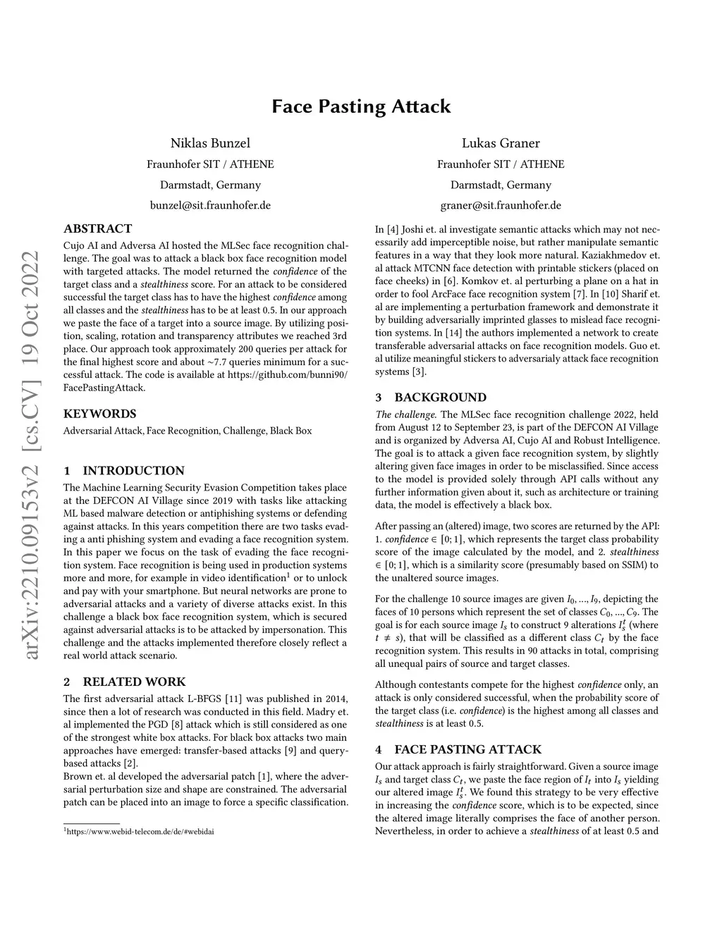 Cujo AI and Adversa AI hosted the MLSec face recognition challenge. The goal was to attack a black box face recognition model with targeted attacks. The model returned the confidence of the target class and a stealthiness score. For an attack to be considered successful the target class has to have the highest confidence among all classes and the stealthiness has to be at least 0.5. In our approach we paste the face of a target into a source image. By utilizing position, scaling, rotation and transparency attributes we reached 3rd place. Our approach took approximately 200 queries per attack for the final highest score and about ~7.7 queries minimum for a successful attack. The code is available at https://github.com/bunni90/FacePastingAttack .
